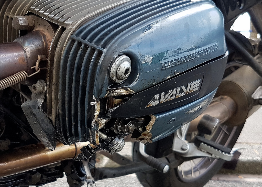 Ventiltrieb links wahrscheinlich beschädigt, zum Wiederaufbau (Motorrad hatte sich beim Unfall überschlagen,