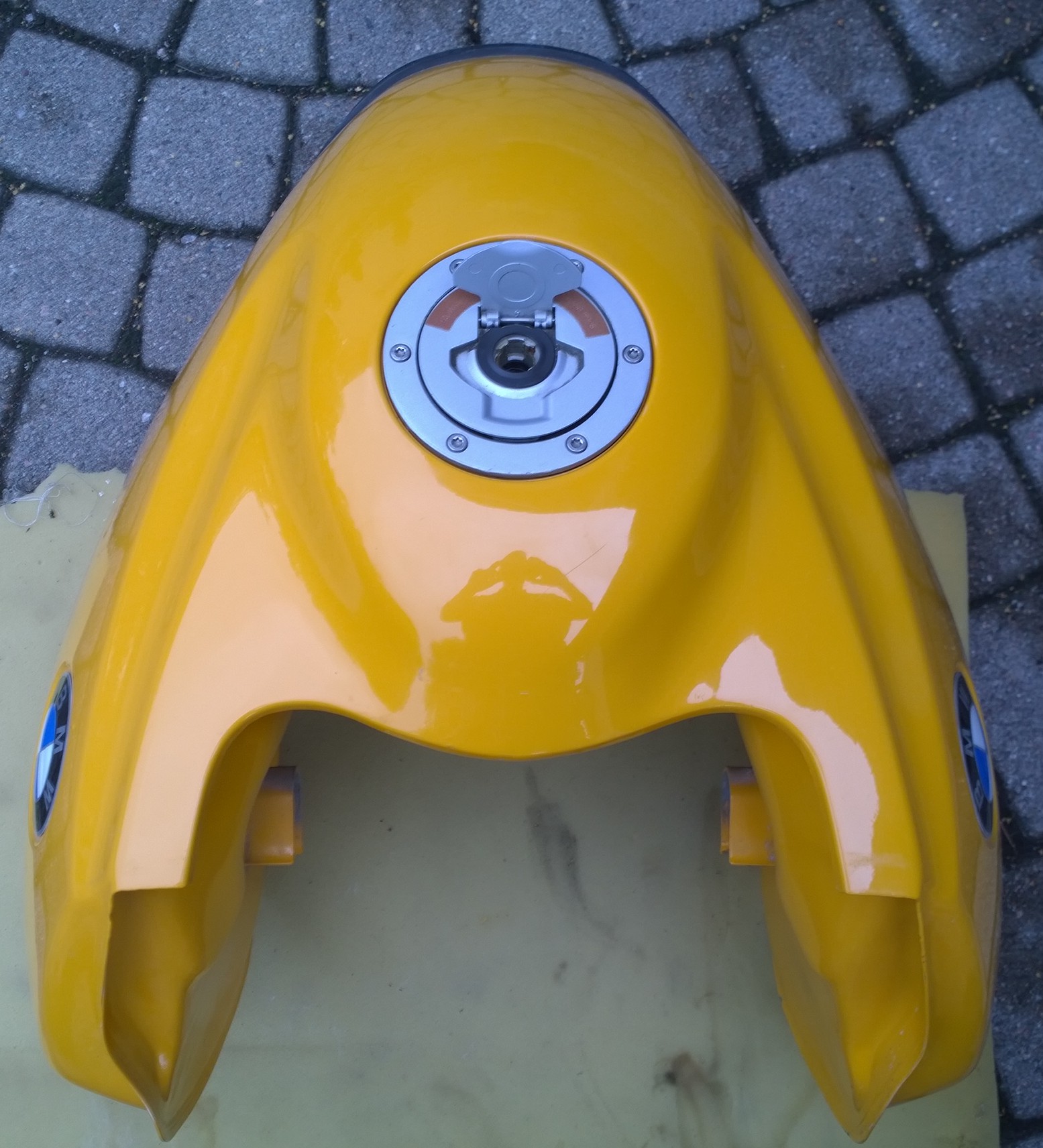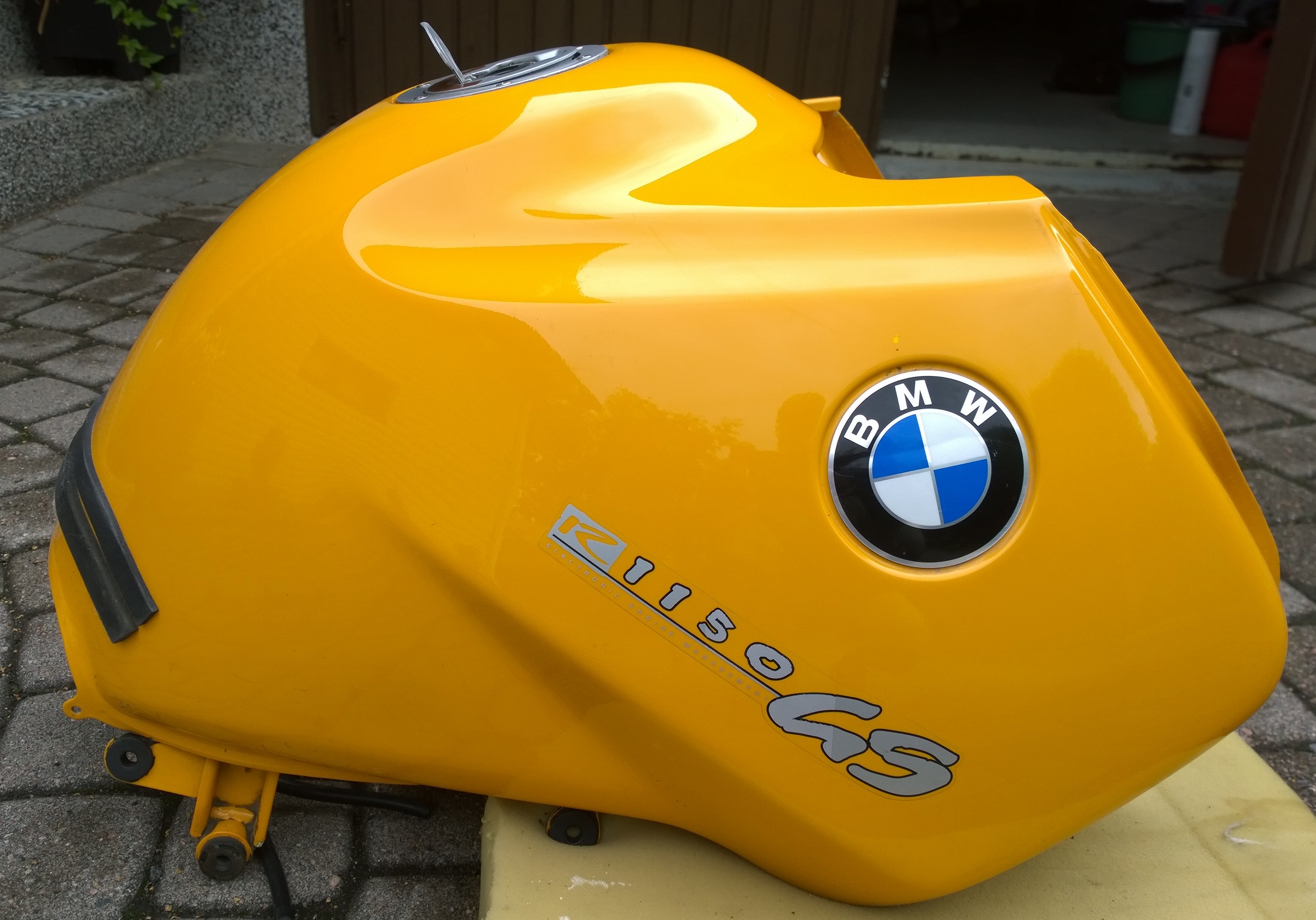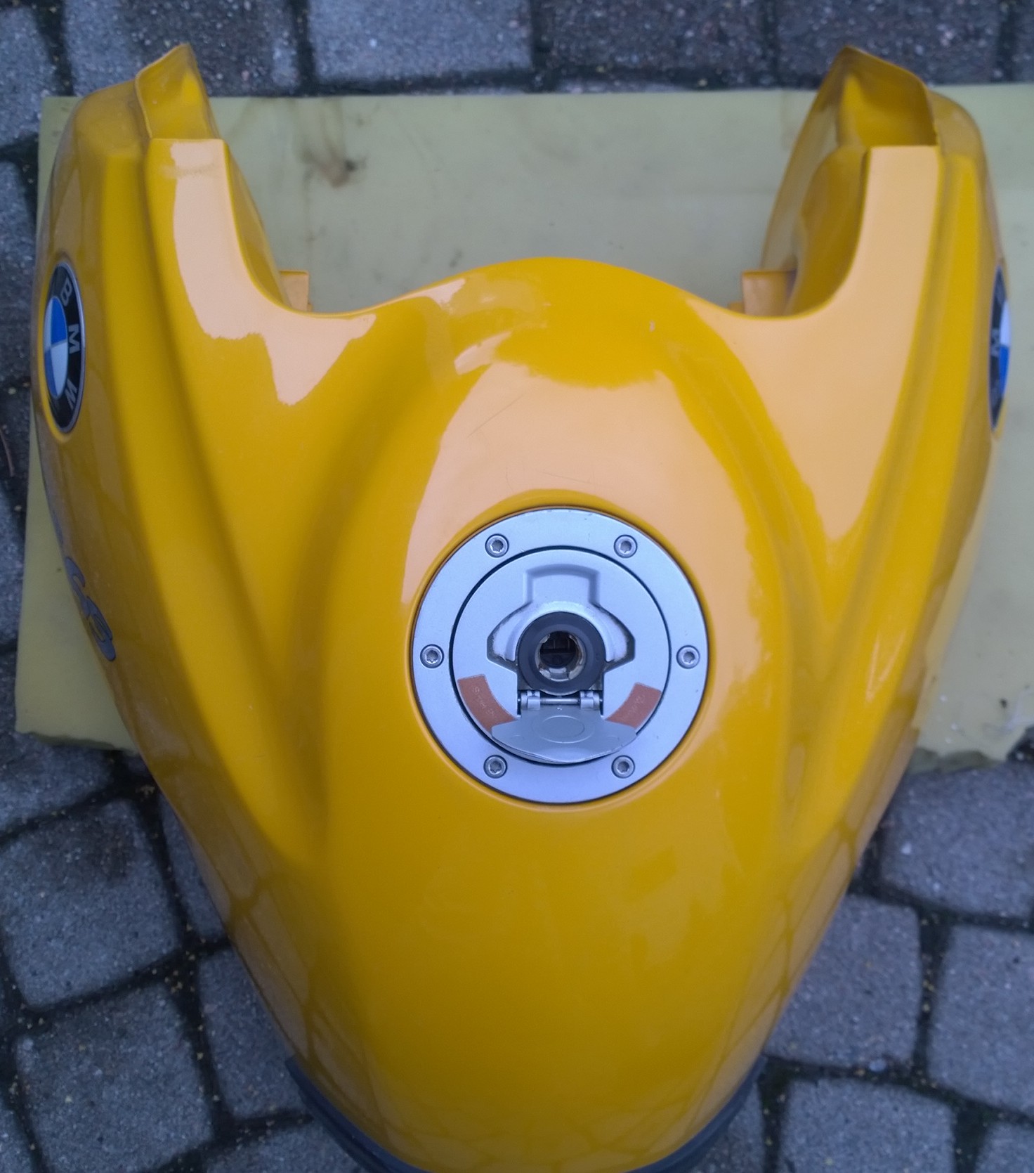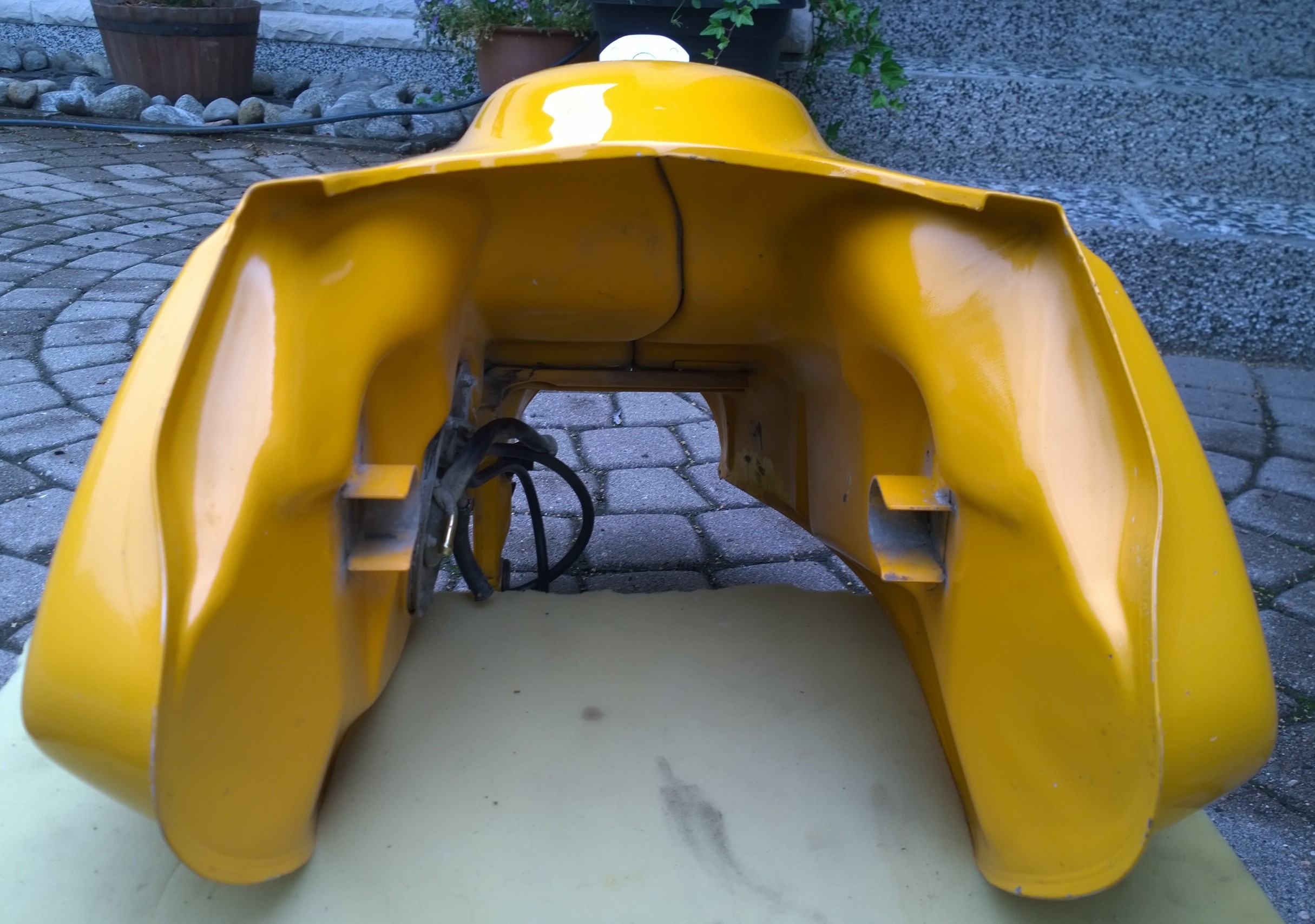 Der Tank ist gelb (Mandaringelb?), 18 Jahre alt (ca. 130 tkm), hat dementsprechend Gebrauchsspuren aber keine Beulen. Hat auch bis zum Wechsel einwandfrei funktioniert.