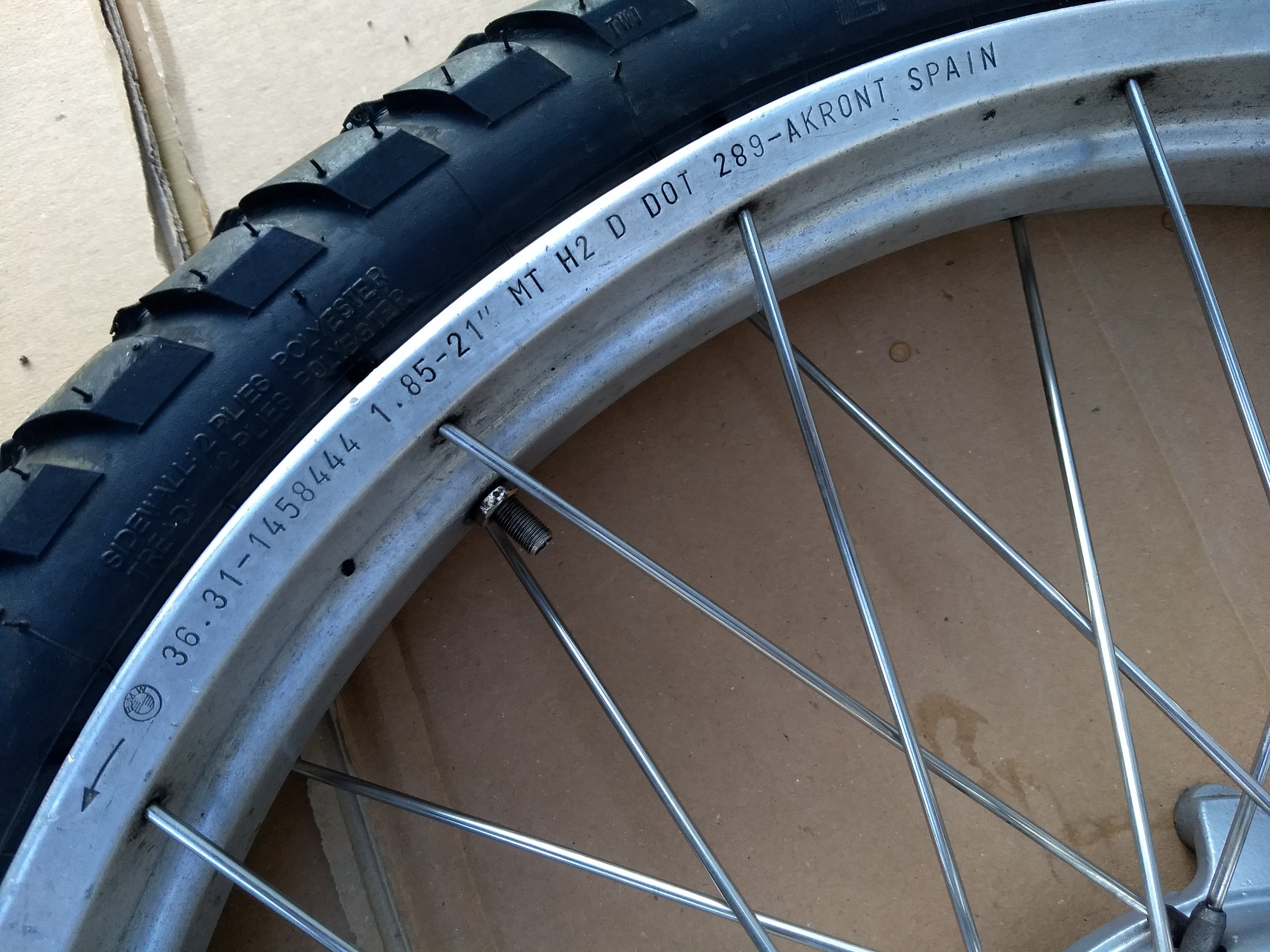 The 21" wheel is assebled from R1100GS hub, R100GS rim and custom made stainless steel spokes made by HannWheels (nipples and screws were bought original new from BMW)