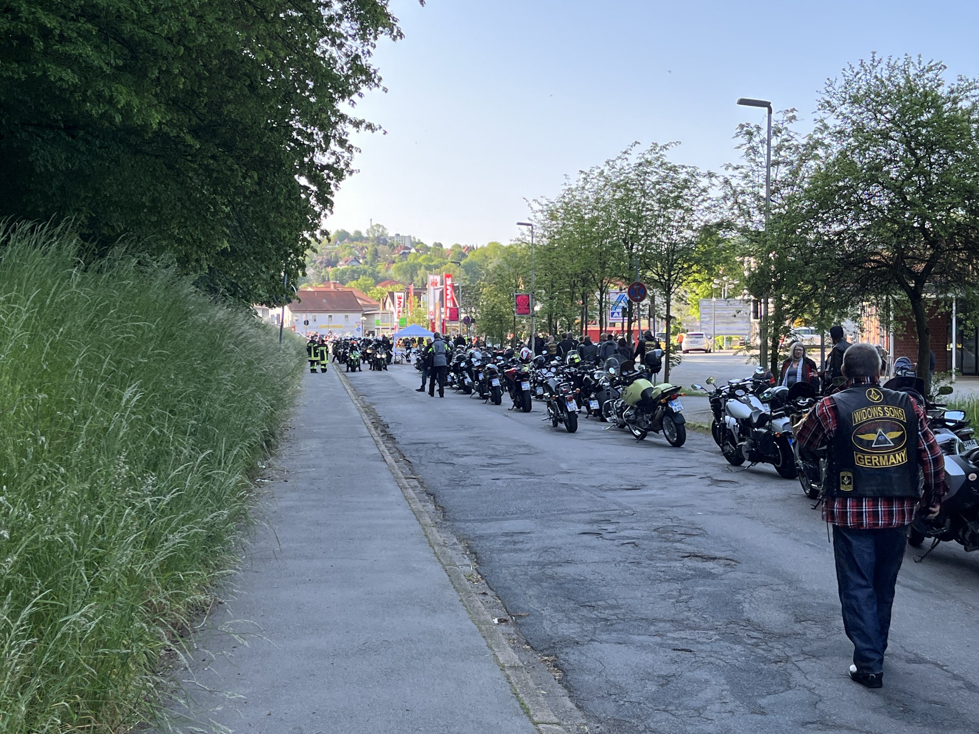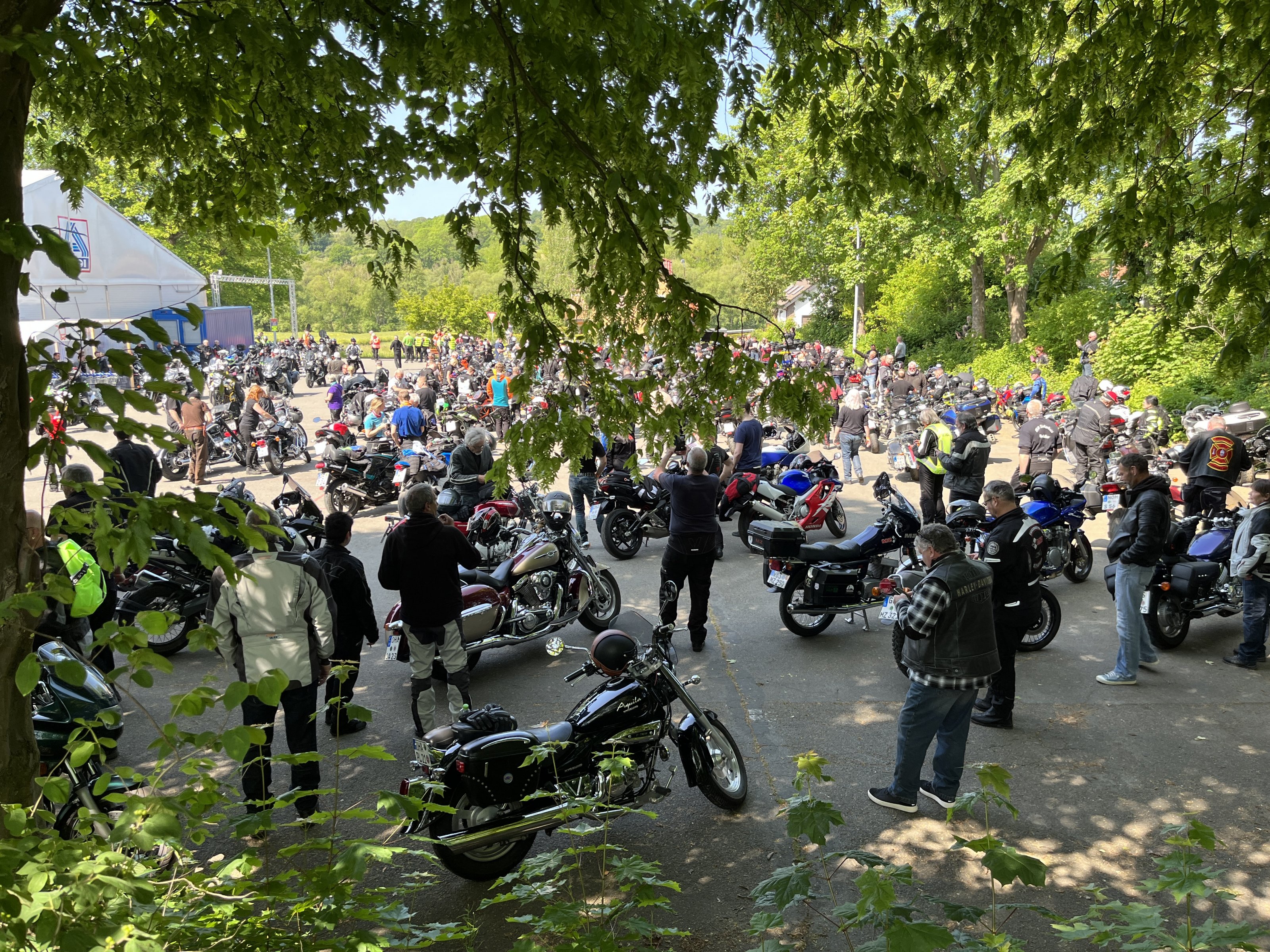 Dann ging es mit >500 Biker Richtung Göttingen über schöne Bundesstraßen und Ortschaften wo immer wieder Menschen standen und winkten. In Göttingen auf dem Hof einer Spedition gab es dann das Mittagsbuffet mit kalten Getränken, Brot, Brötchen und Aufschnitt.