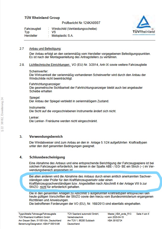 Genauso würde ich aber auch nie prüfen lassen, ob die Fahreigenschaft beieinträchtigende Wechselwirkungen zwischen der Zubehörfussraste und dem Windschild (jeweils mit ABE) bestehen.