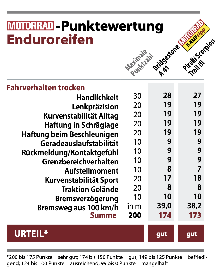 Trotzdem bin ich im Falle des A41 Maxells Meinung. Der MOTORRAD Test scheint seriös und der Reifen daher im Neuzustand mit der Konkurrenz absolut vergleichbar. Lediglich die rasch voran schreitende Schulterabflachung scheint ein Thema. Die ist aber in hohem Maße abhängig von der Fahrweise, die wiederum stark vom Gelände abhängt (Stichwort: Hineinbremsen in Kehren auf Alpenpässen).
