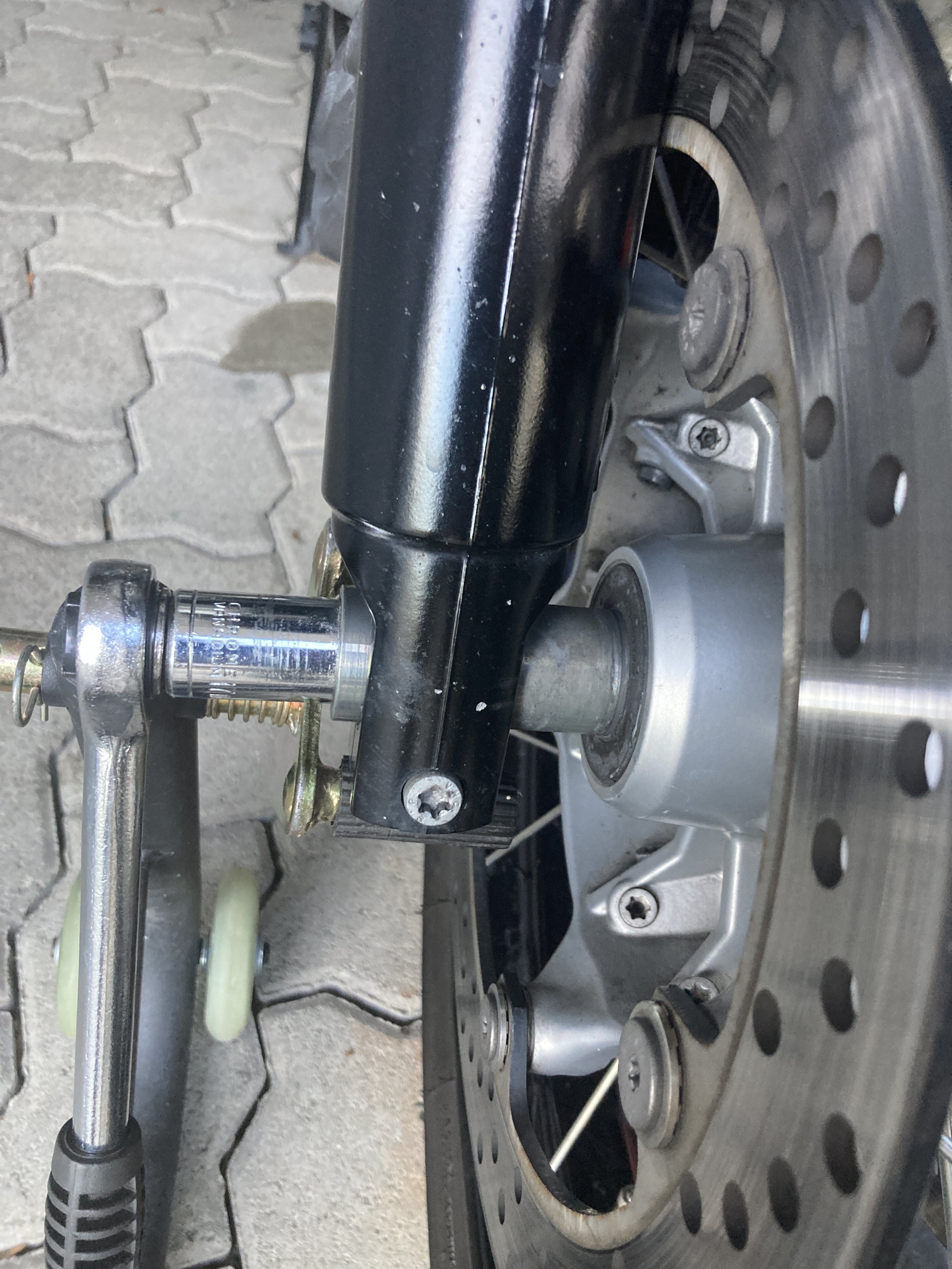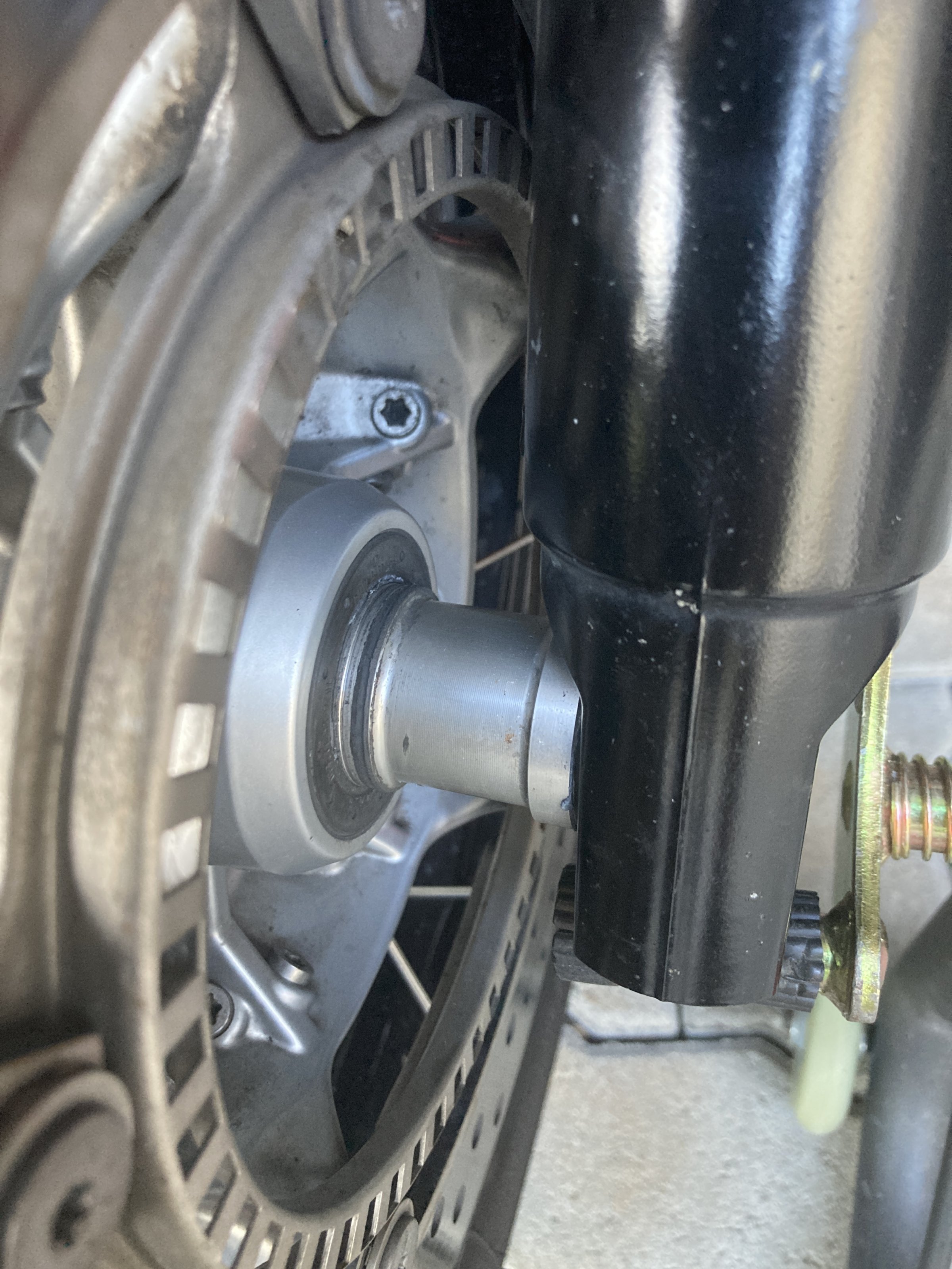 Gerade habe ich nochmal die Achse gelöst, vorher beide Bremssättel demontiert, alles wieder mit den korrekten Drehmomenten montiert. Fotos anbei. Ich erkenne null Unterschied vorher - nachher. Und wie Serpel richtig schreibt, ist das Gewinde fest in den Fuß des linken Holms geschnitten. Ein Verschieben der Achse und damit des Abstandes zw. ABS Kranz und Sensor ist eigentlich nicht möglich.