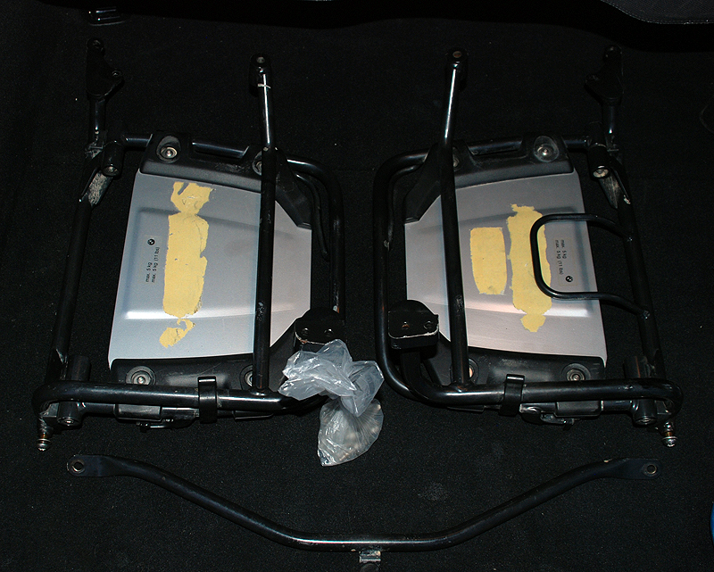 Diese gelben Streifen auf den Trägern waren mal doppelseitiges Klebeband oder so, das hab ich bereits so von meinem Vorgänger übernommen. Man sieht das Zeug nicht, wenn entweder ein Koffer montiert ist oder sie hochgeklappt sind (also eigentlich nie). Davon abgesehen ist dieses Klebeband vollständig ausgetrocknet, so dass es sich mit einem Fingernagel abkratzen lässt.