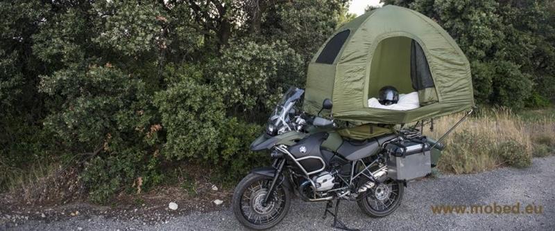 Angeblich (MoBed | MoBed) -man sieht es nicht- wird das Bike verzurrt um nicht umzufallen .. ohne wohl besser mit Helmpflicht im Zelt ...