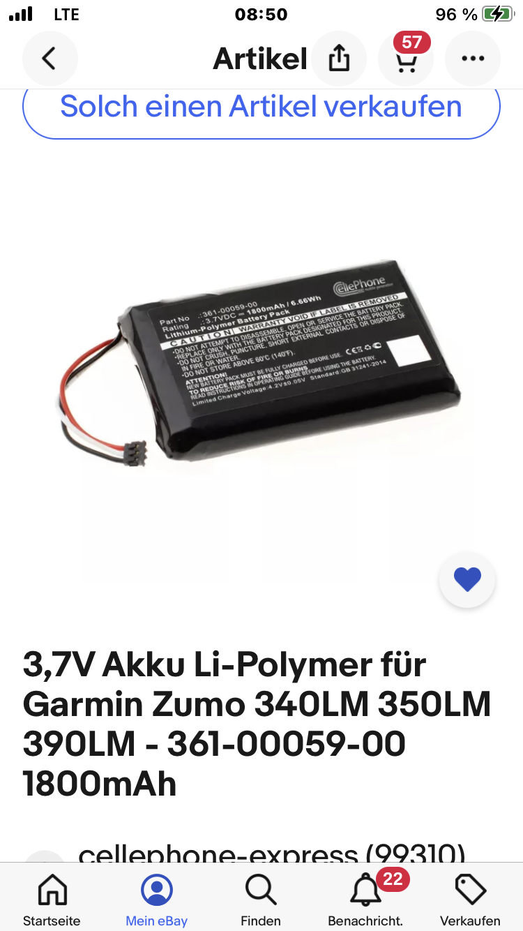 Hab Probleme mit Garmin. Die verschicken keine Akkus. Ich kann das Gerät einschicken, dann kommt ein Kostenvoranschlag, usw. Den Akku hatte ich nach 4 Min. in der Hand. Im Internet finde ich einen Akku für das Garmin 396.
