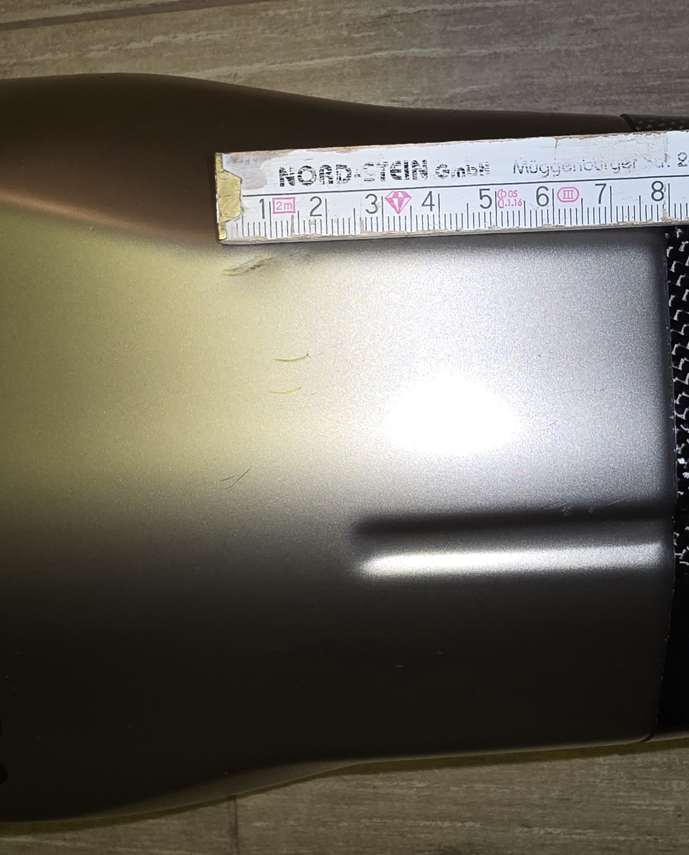 Er hat eine ca 1,5cm große Macke, die im montiertem Zustand kaum auffällt, weil es der Teil ist, der leicht nach unten geneigt ist. Aber . Ist halt da.