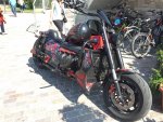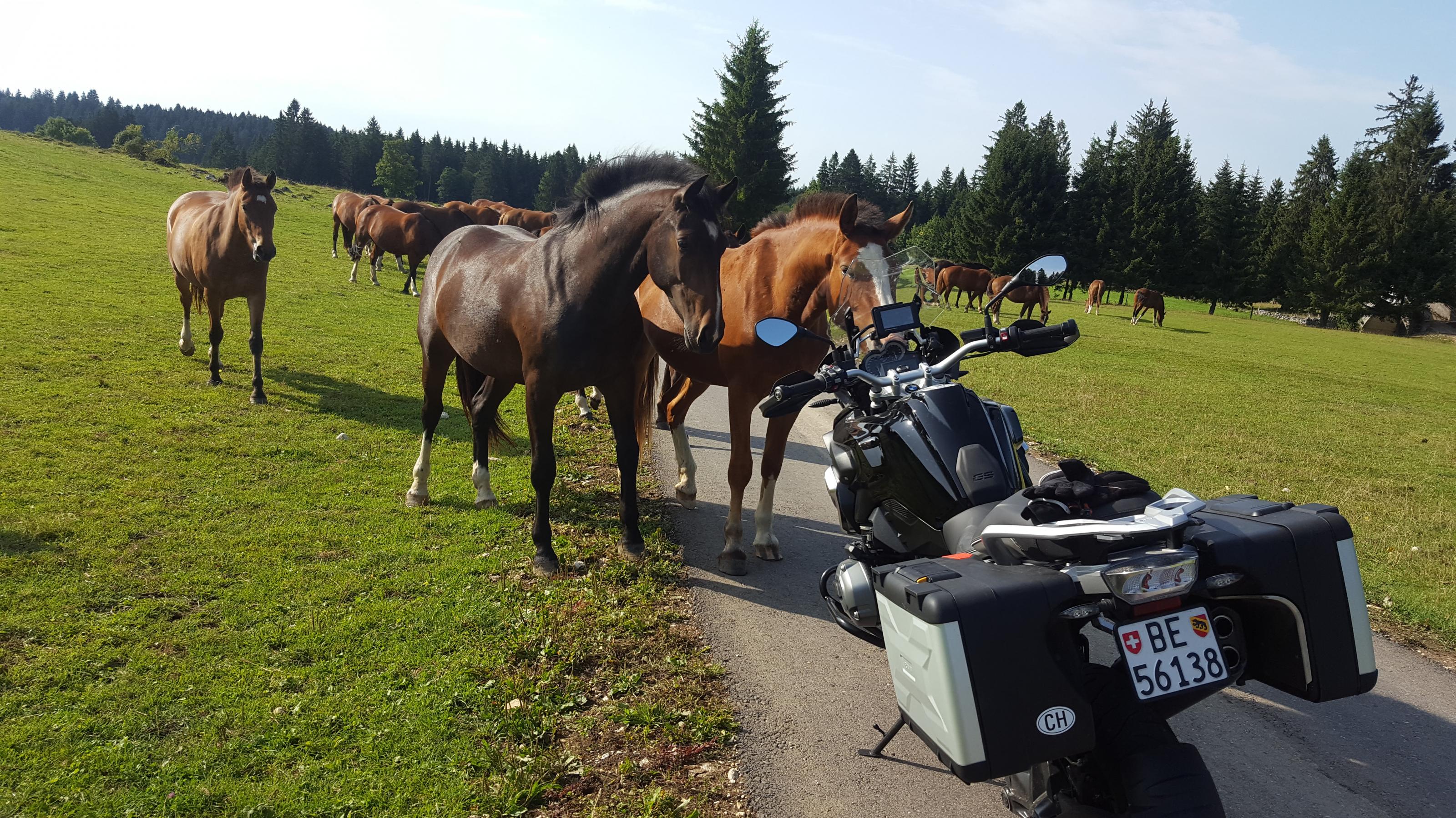 Heute im Schweizer Jura, schmale Strässchen, wenig Verkehr. Und freilaufende Pferde, also mal langsam gemacht um ein zwei Fotos zu schiessen. Da kam dann ein Gaul nach dem anderen um mein Mopped zu begutachten oder gar dran zu lecken. Als ich wegfahren wollte gingen die nicht mehr auf die Seite. Erst nach dem Starten des Motors und ein paar heftigen Drehungen am Gasgriff mit Unterstützung des Acropovic wichen die Hottehühs zurück und liessen mich weiterfahren. Komisches Gefühl von ca 15 Gäulen umringt zu sein....