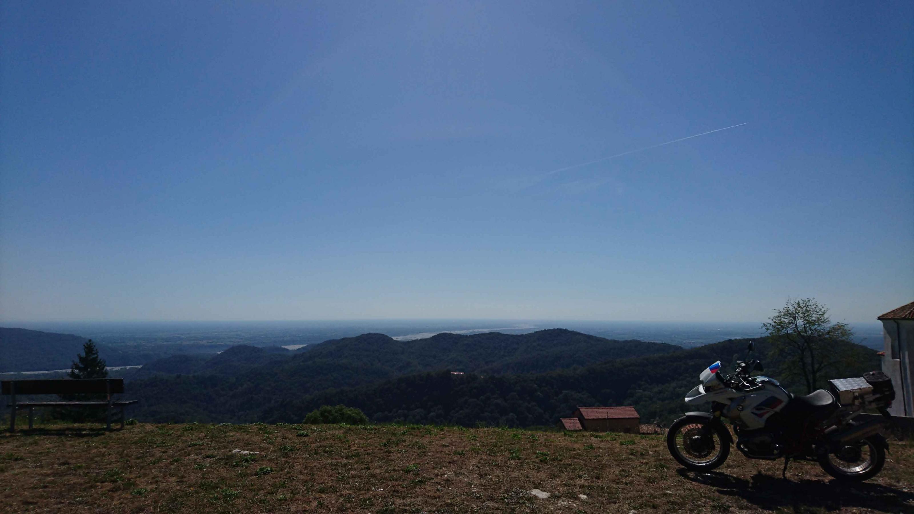 Blick vom "Balkon Karniens" bei Clauzetto Richtung Venedig (von hier noch ca. 90 km Luftlinie) und über das breite Bett des Tagliamento (dort im Flussbett findet im Juni immer die Baja Italia Rally World Cup statt https://www.italianbaja.it/)