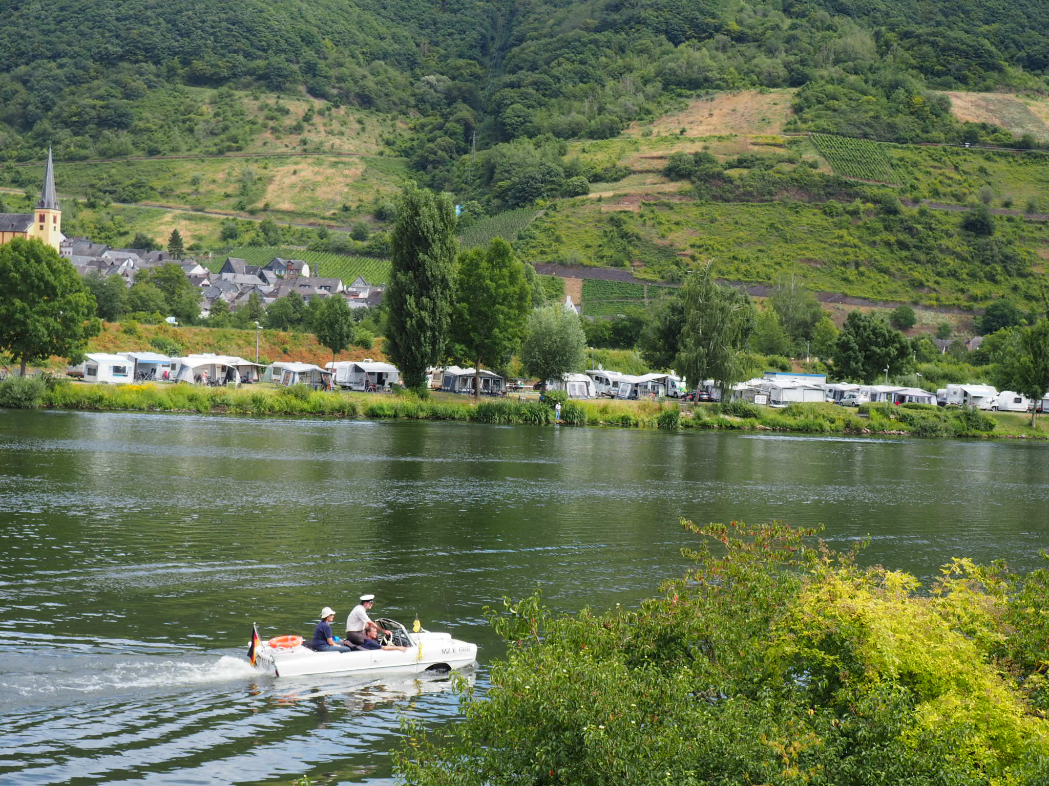 Das putzige Teil sieht mir nach einem Amphicar 770 ausVon der Terrasse vom Hotel dann noch ein putziges Gefährt auf der Mosel entdeckt.