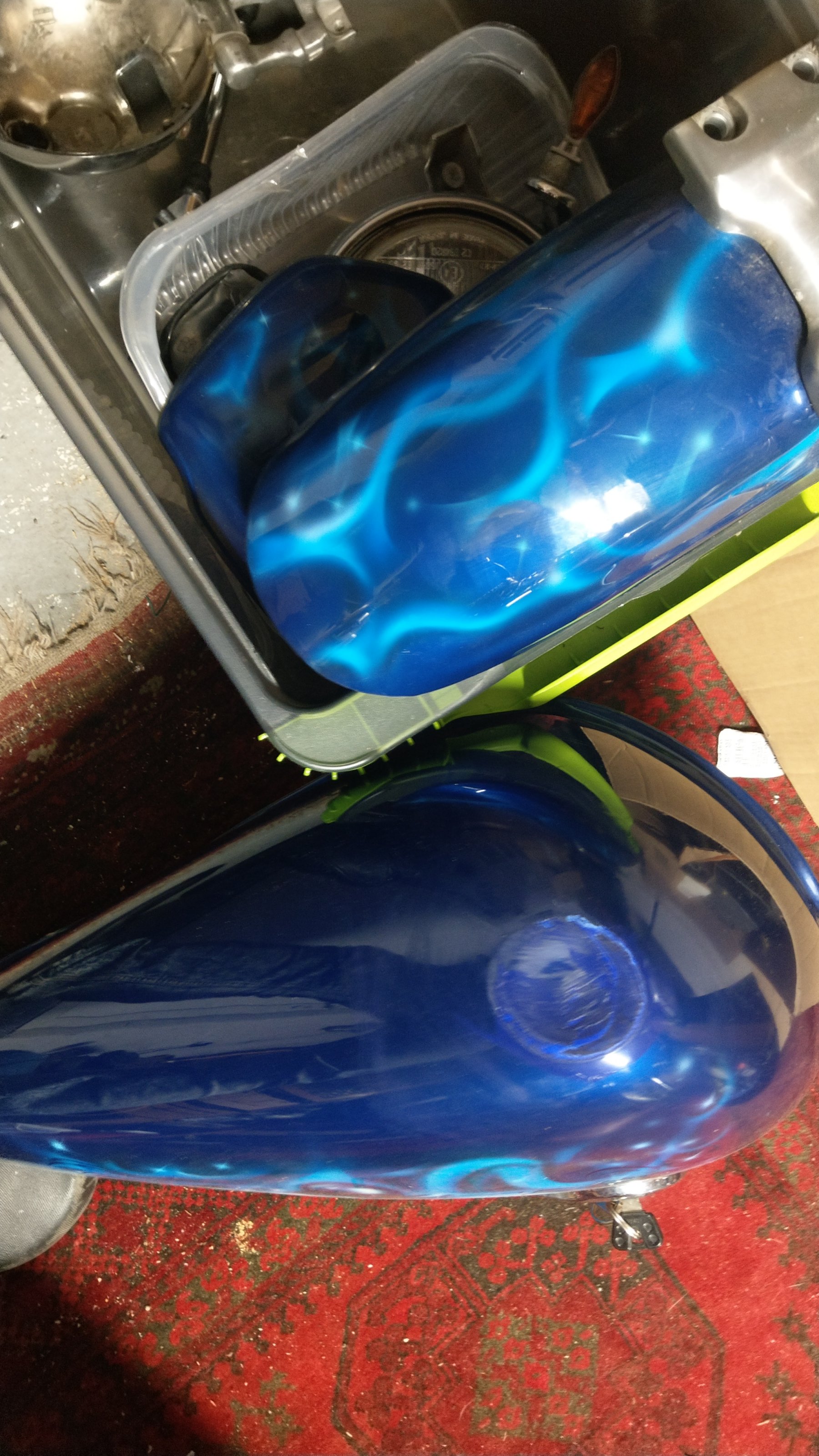 Jetzt geht es den Lackteilen an den Kragen, aus dem blauen airbrush wird tiefes Schwarz. Das bedeutet jetzt: Schleifen, schleifen, schleifen. Bisle spachteln, nĂ€chste Woche soll es ein Wetter-Hoch geben. Da kann ich dann draußen fĂŒllern, nochmal schleifen und lackieren.