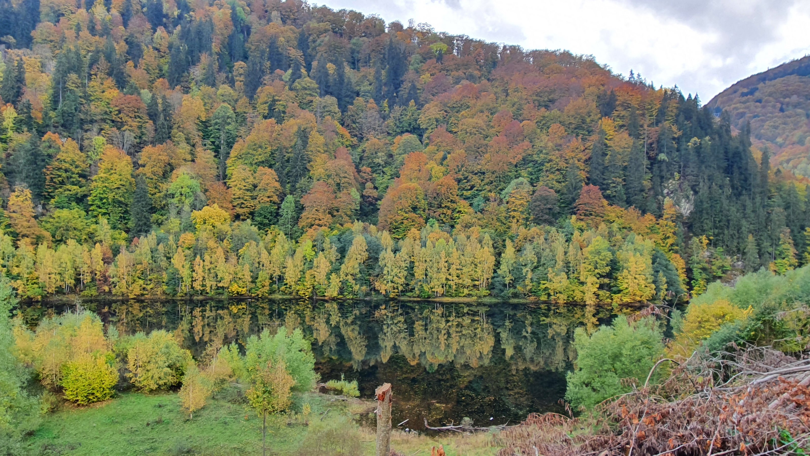 Knapp vor der Sättigung, Nebel, tiefe Wolken, Nieselregen. Tropfen, wie aufgereihte Perlen an den Nadeln von Tannen und Fichten, duftendes Herbstlaub, triefendes Moos. Im Hintergrund das verhaltene Rauschen des bergab eilenden Wassers.