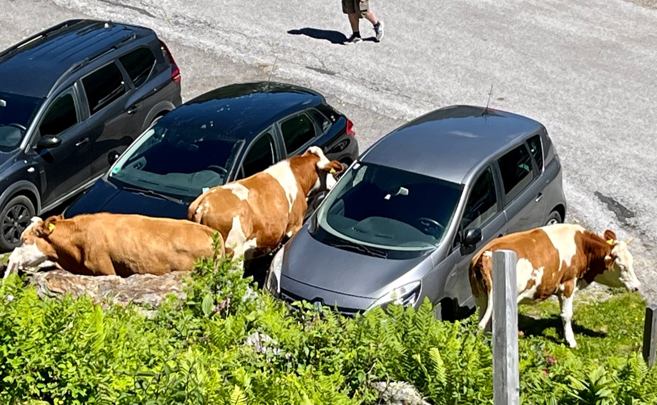 Das erinnert mich an eine Szene vor einigen Jahren auf einem Parkplatz an der Verdonschlucht. Dort sprang ein Ziegenbock auf die Motorhaube einer neu aussehenden E-Klasse um besser an die Zweige eines Busches zu kommenHoffentlich brauchen die Kühe nicht etwas um sich das Fell sauber zu schruppen. Ich weiß nicht ob Autospiegel dafür eine Zulassung haben.
