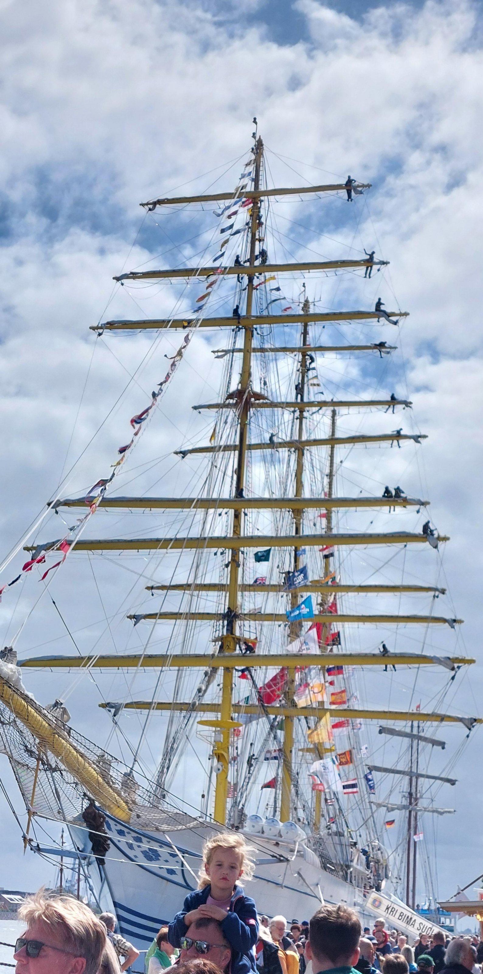 Im ruhigen Hafen auf den FuĂpferden unter den Rahen rumzuturnen dĂŒrfte da niemand ins Schwitzen bringen, das mĂŒssen die auch drauĂen bei Seegang beherrschen, aber erstaunlich, dass die Republik Indonesien an der HanseSail teilnimmt..