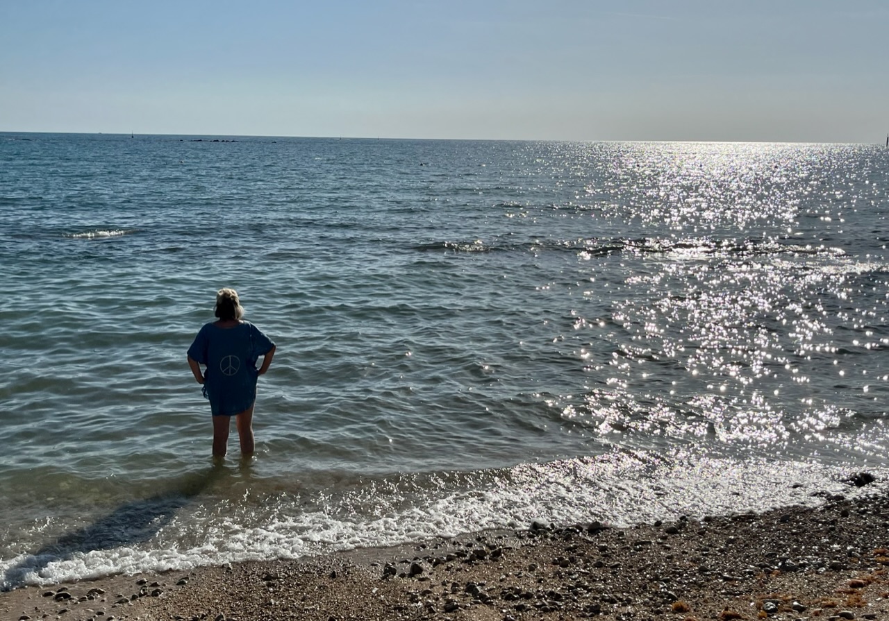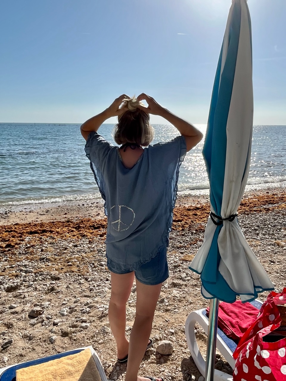 Schönes T-Shirt hast du da an.Dieser Stress… und schon wieder am Meer