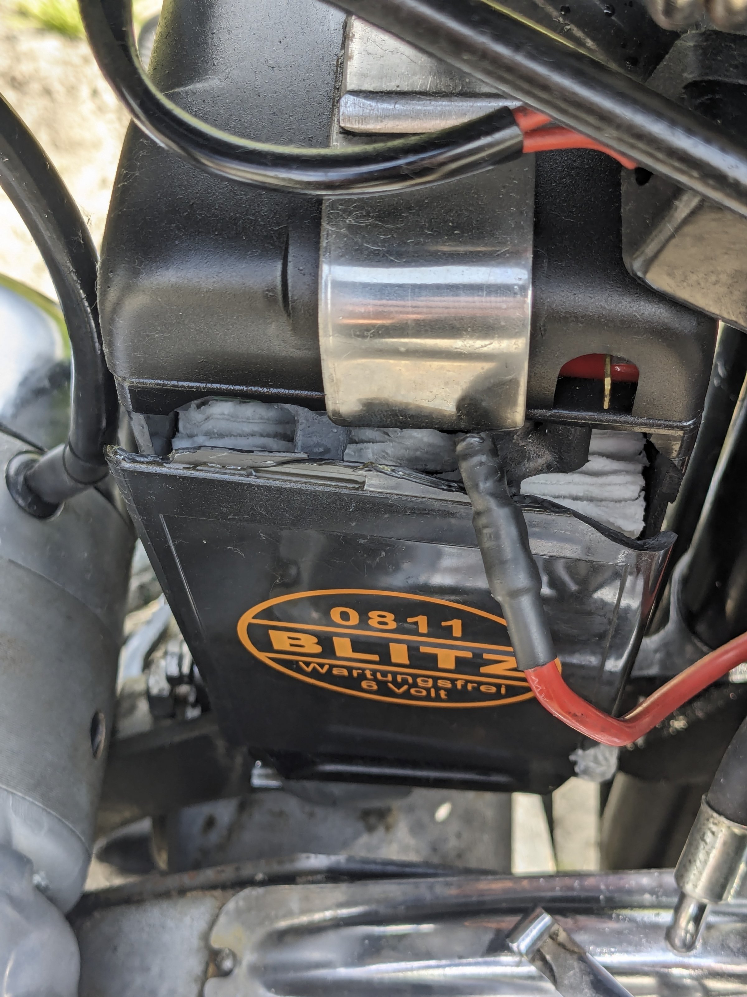 Meine Consul II kann auch Batterien fressen ;). Zum einen werden die zerschüttelt, weil sie ungedämpft den "Good Vibrations" ;) ausgeliefert sind, zum anderen werden sie ständig am Rande der Tiefentladung betrieben :(. Die Lima (das ist das mickrige Teil unten vor dem Akku, angetrieben über eine Rollenkette) liefert bei 6V nur 45W als Dauerleistung, das reicht, für heutige Verhältnisse, fahren mit eingeschaltetem Licht, bei weitem nicht aus. Zündung ??W, 35W Abblendlicht, 5W Standlicht, 5W Rücklicht, ab und an Bremslicht mit 21W, und, mit Seitenwagen, auch noch die 5W für Begrenzungsleuchte und 21/5W für Brems-/Rücklicht am SW. Dementsprechend ist der Ladezustand des kleinen Akkublocks -6V, 12Ah, ursprünglich waren es nur 7Ah- fast immer am unteren Ende der Skala :(.