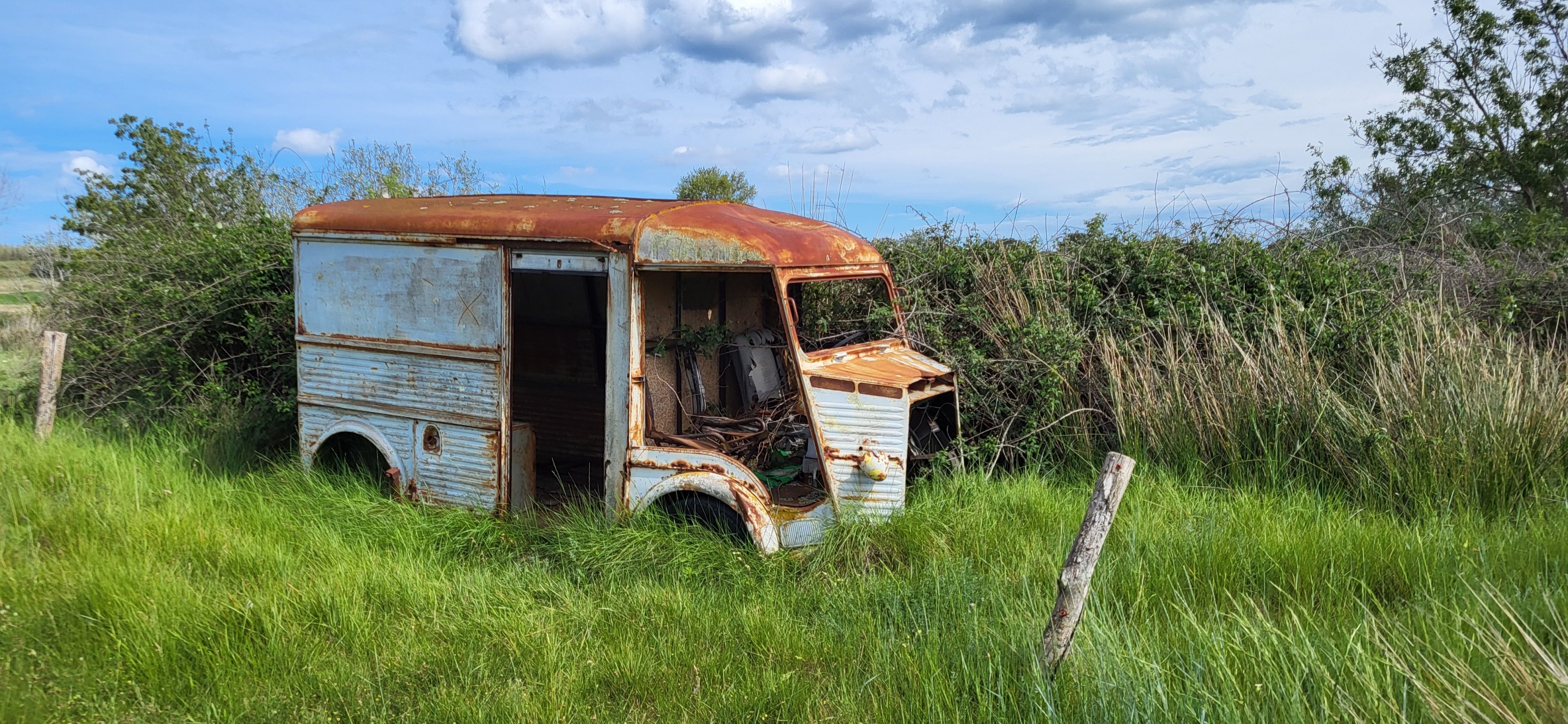 Farbe wird überbewertet.Im Hinterland von Beziers bei einer MTB Tour entdeckt. Hinten fehlte ein Rad und der rostigen Wagenheber klemmt noch drunter.... Aber sonst, ein paar Kabelbinder, etwas Tape und Farbe.....