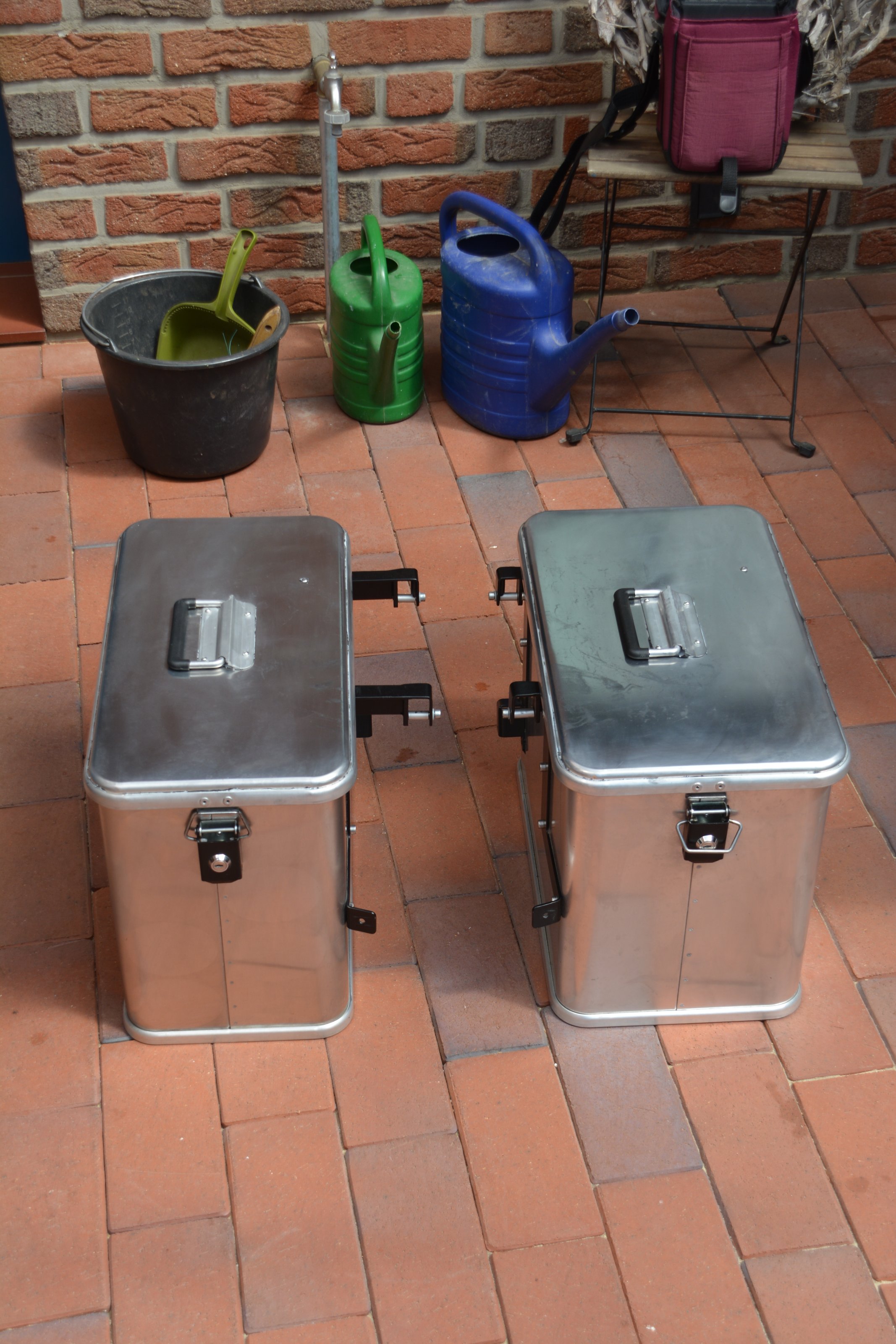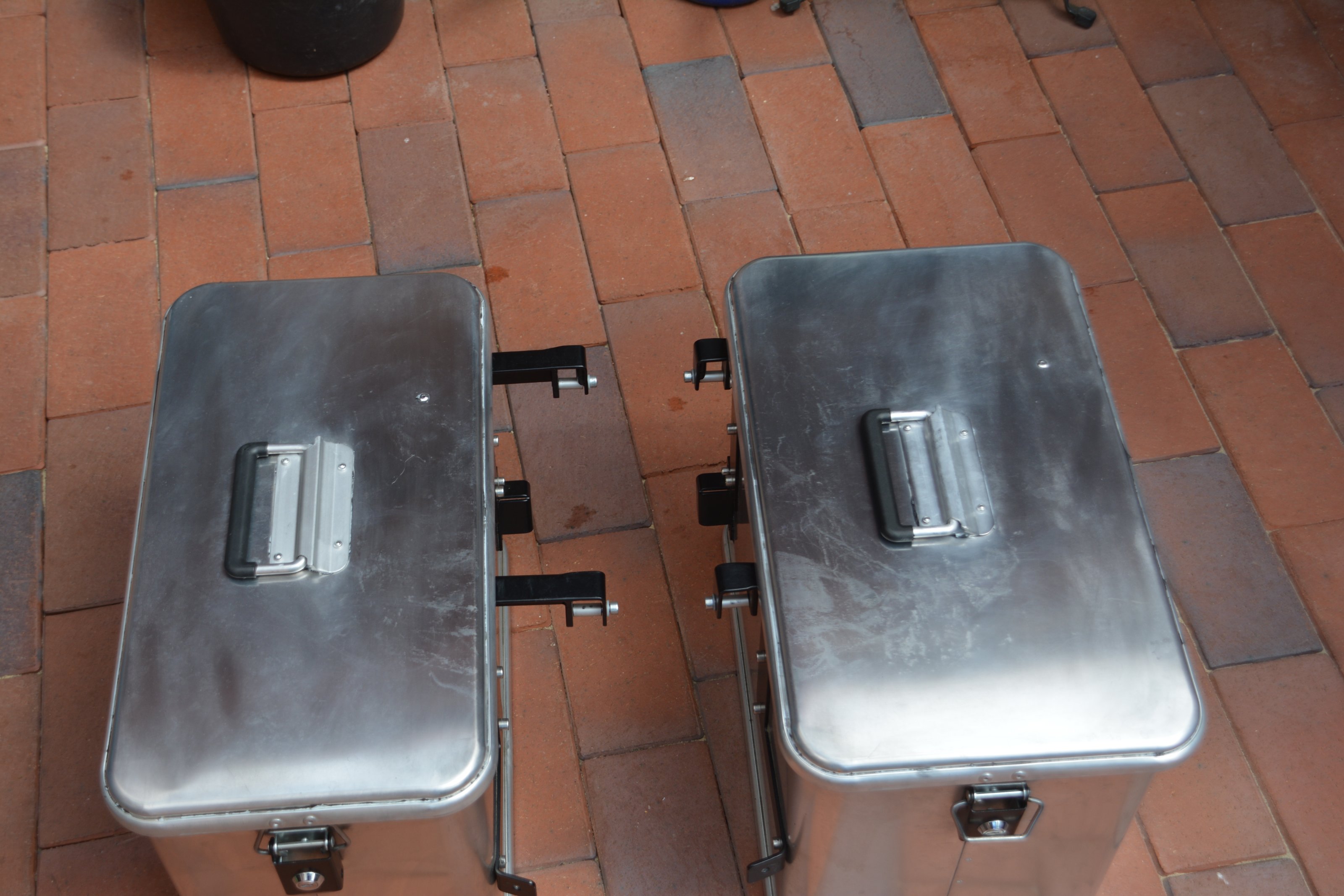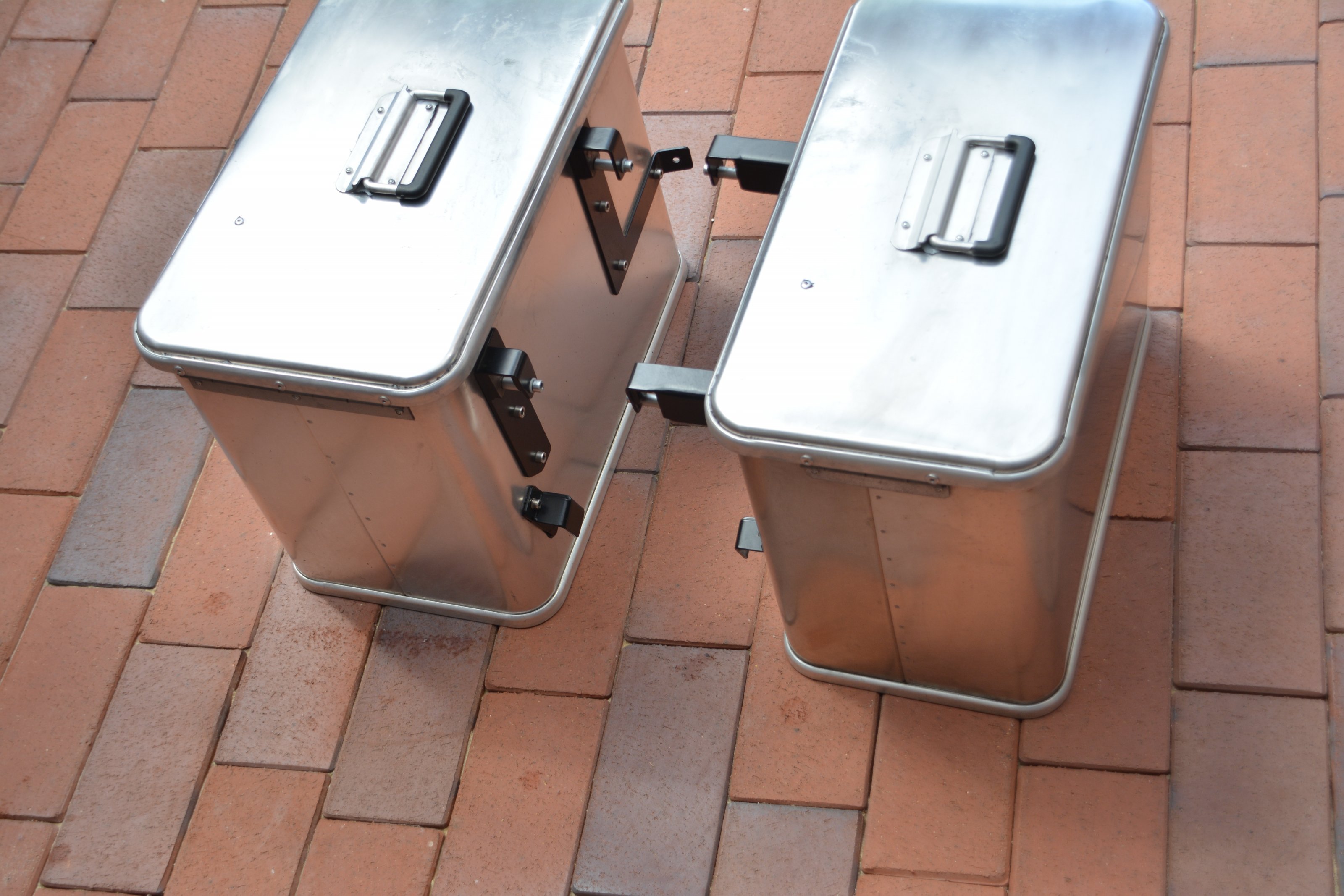 Der linke Koffer hat 35 L Volumen, der rechte 41 Liter. Die Halter sind aus Edelstahl schwarz pulverbeschichtet. Auf den Deckeln sind Gebrauchs-
