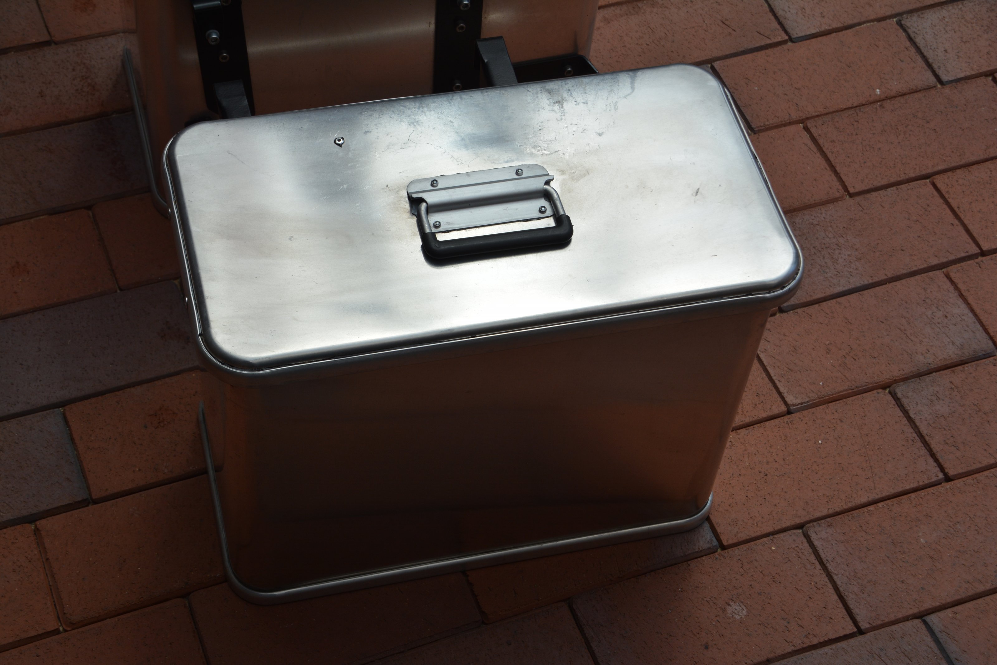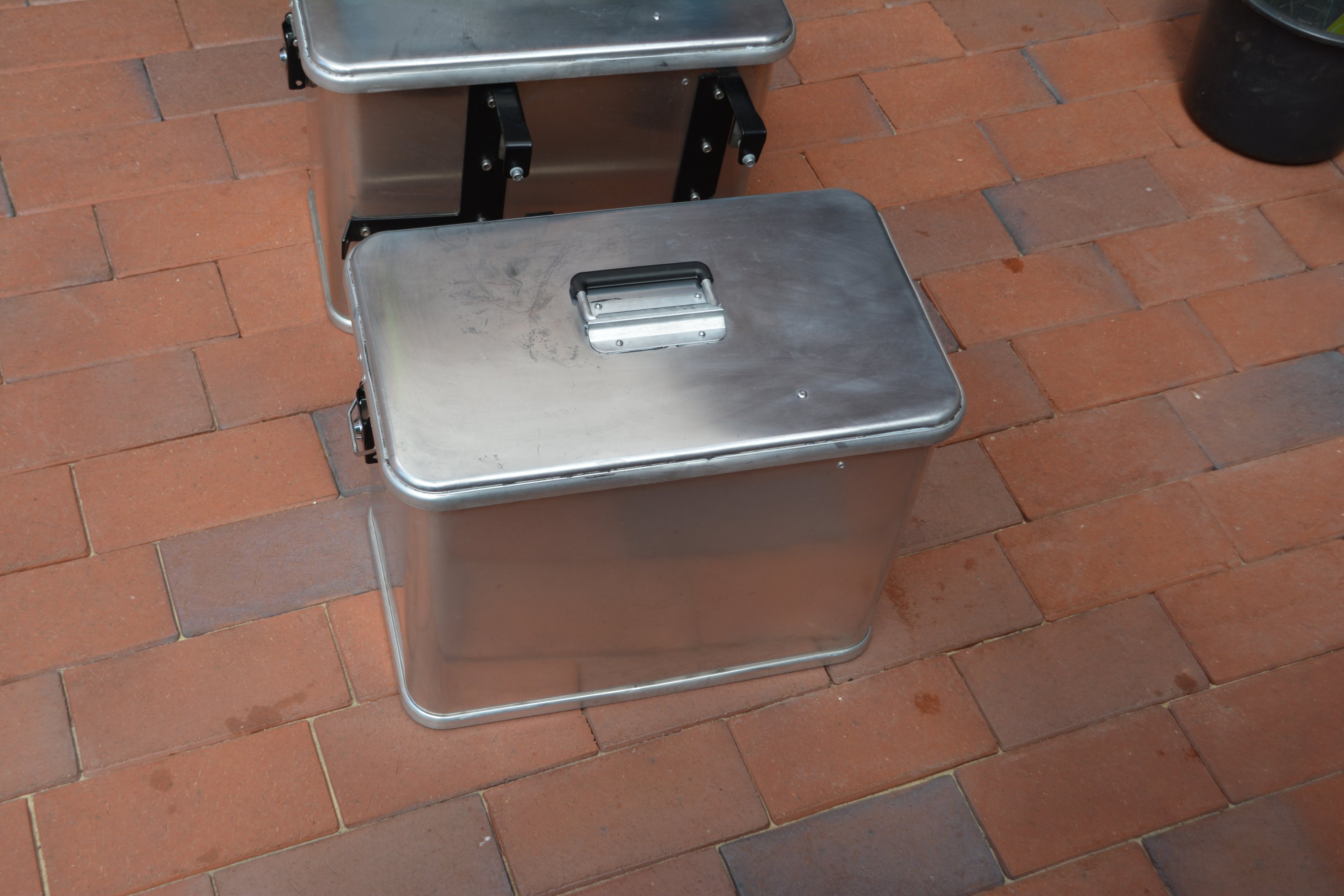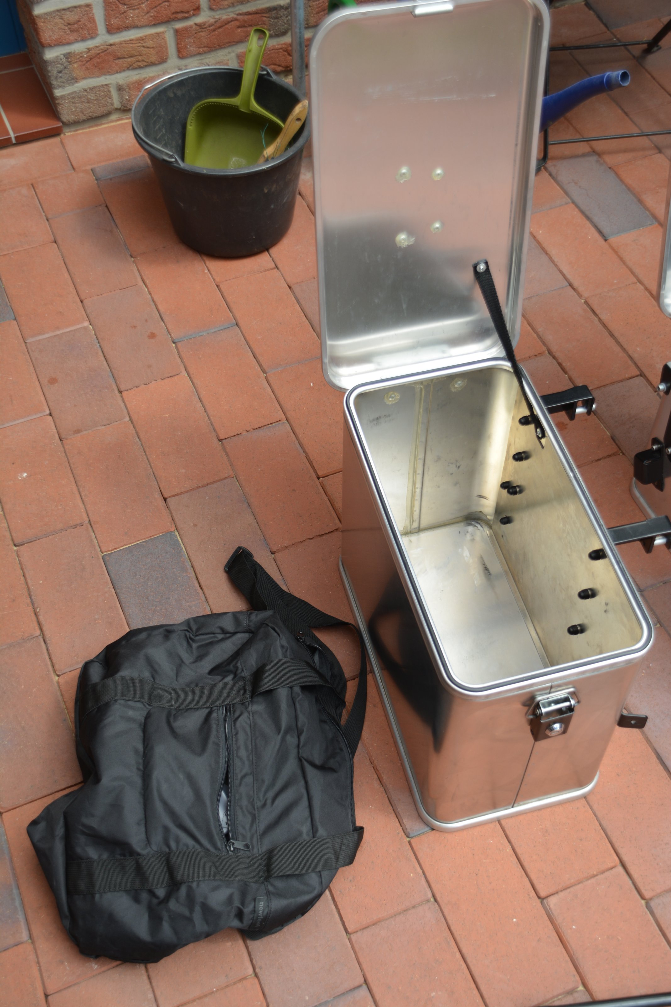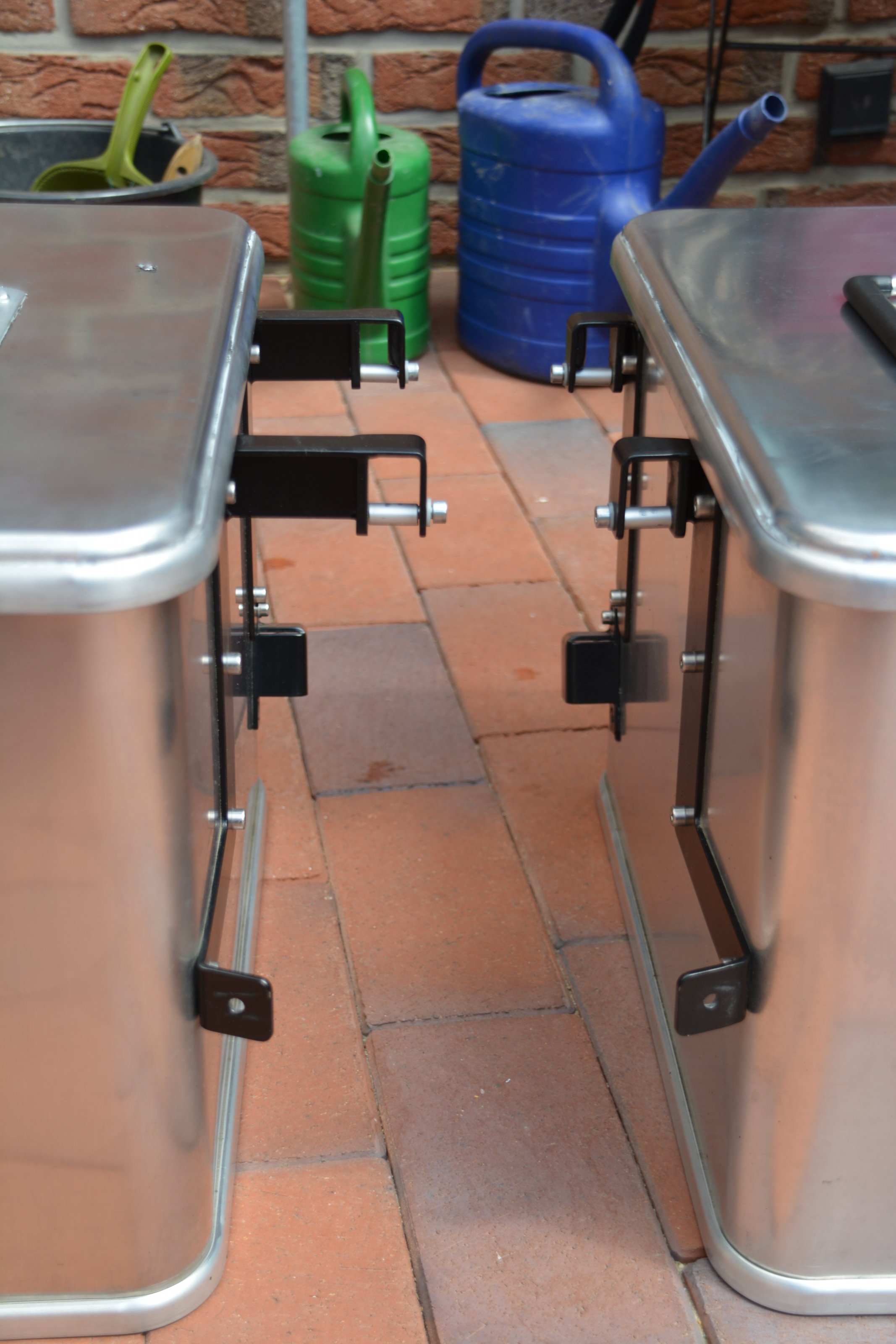 Der linke Koffer hat 35 L Volumen, der rechte 41 Liter. Die Halter sind aus Edelstahl schwarz pulverbeschichtet. Auf den Deckeln sind Gebrauchs-
