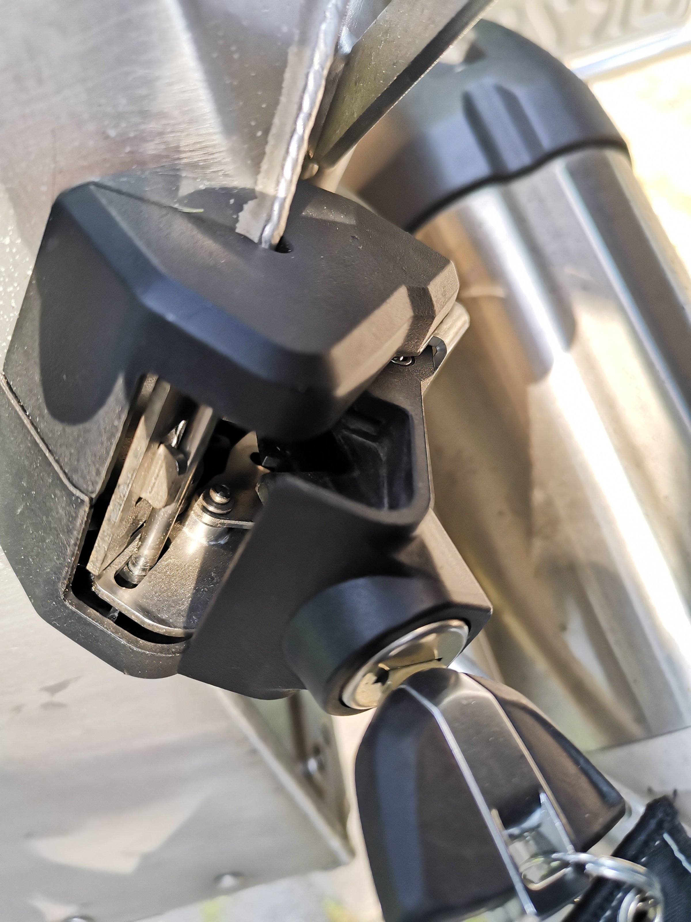 Hallo Leute ich habe heute mal vom lieben freundlichen zwei gebrauchte Alukoffer erstanden. Leider habe ich das Problem dass beim rechten Koffer wenn ich ihn auf den Rahmen gesetzt habe, er sich einfach nicht, mit dem Schloss, welches das Abnehmen verhindern soll schließen lässt. Der Haken/Bügel ist nicht verbogen und dennoch lässt sich das Schloss nicht komplett zurückklappen. Der Koffer sitzt ganz auf dem Rahmen und ganz zurück soweit es geht. Hat einer eine Idee?