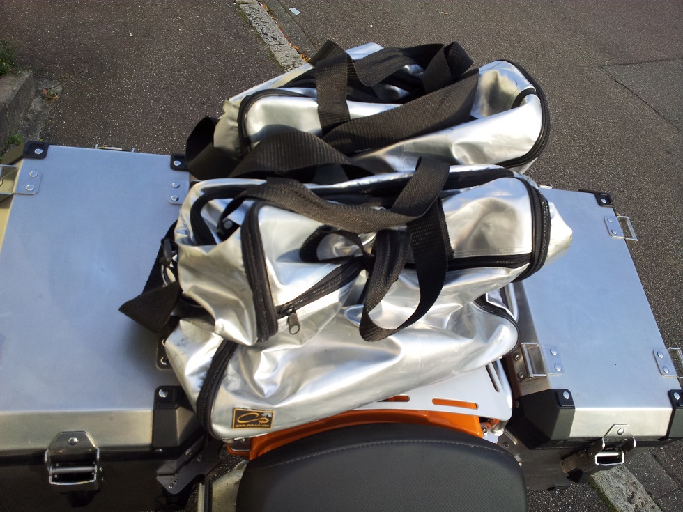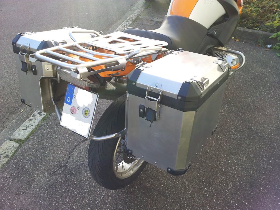 aus Edelstahl und Innentaschen.Da ich die Koffer so gut wie nie benötige,wäre es eigentlich schade,wenn sie in der Garage dahinsichen.Mit Schlösser,die ich dann vorher ausbaue,um sie umcodieren zu können.Eine kleine Macke ist vorhanden(roter Kreis Bild4)