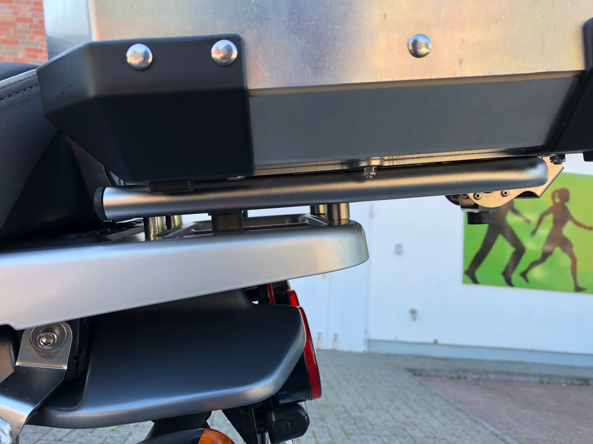 Als Halteplatte habe ich die original F800GS Topcasehalterung für die BMW Aluminiumkoffer gekauft.