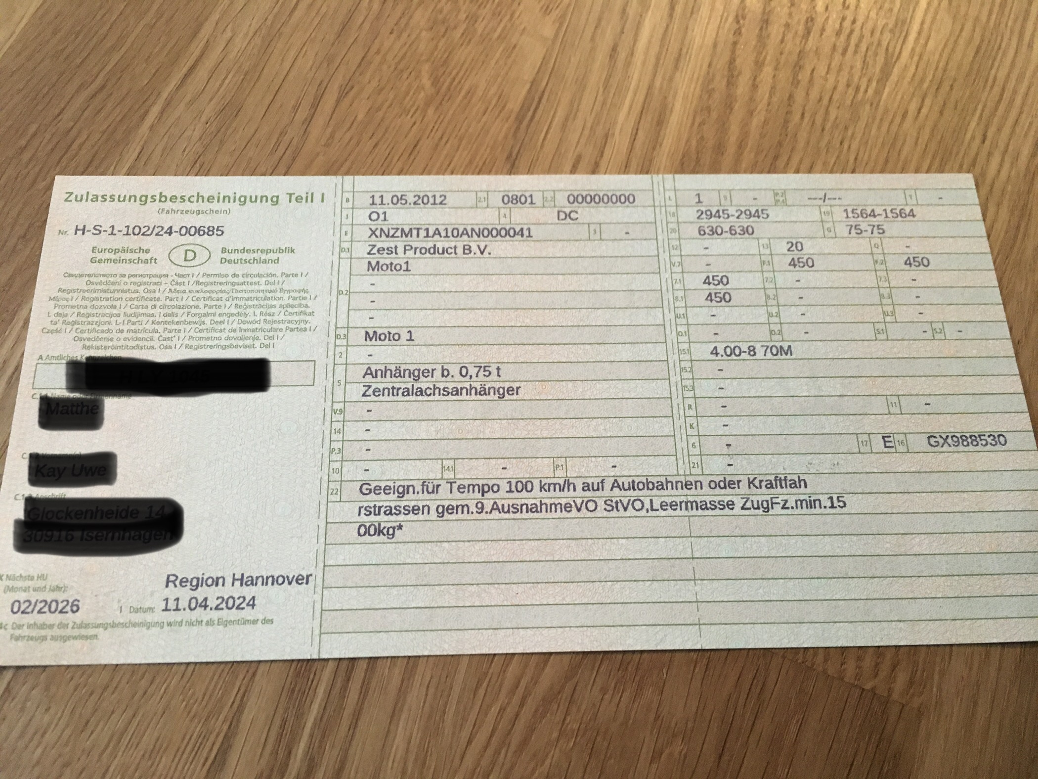 Erstzulassung war 2012. TÜV hat er noch bis 02.2026. Elektrik funktioniert tadellos mit dem 13 poligen Stecker. Die Reifen sind nicht mehr die neusten aber haben noch volles Profil. Neue kosten glaube ich zwischen 20 und 30 Euro.
