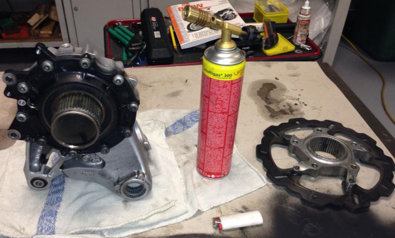 3. Nun muss als erstes der Radträger runter das geht auf 2 Arten. Die grobe Version ist es den Träger mit einem Abzieher von der Achse ziehen dabei kann dieser auch beschädigt werden wenn man Verkantet. Die leichtere und bessere Methode ist erwärmen des Radträgers bis er von der Achse leicht ab zu nehmen ist, hier ist auf die richtige Temperatur zu achten (100°C).