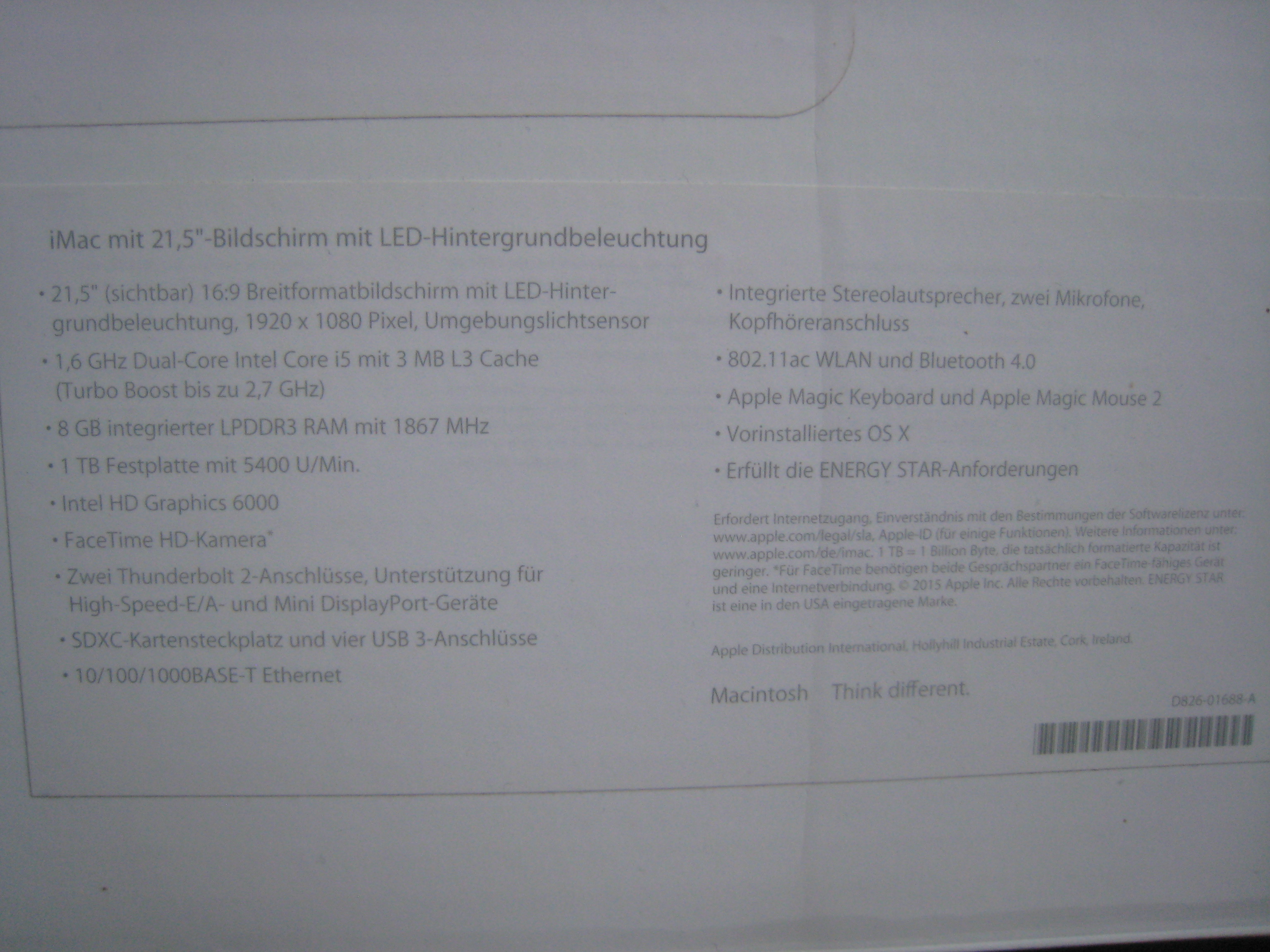 Verkaufe hier im Auftrag meines Vaters einen Apple iMac 21,5" mit der Bezeichnung MK142 D/A, Modell Oktober 2015, Kaufdatum März 2016, also mit Restgarantie, original verpackt, komplett wie neu, Media-Markt Rechnung liegt vor für Euro 850,- (Forumspreis!)