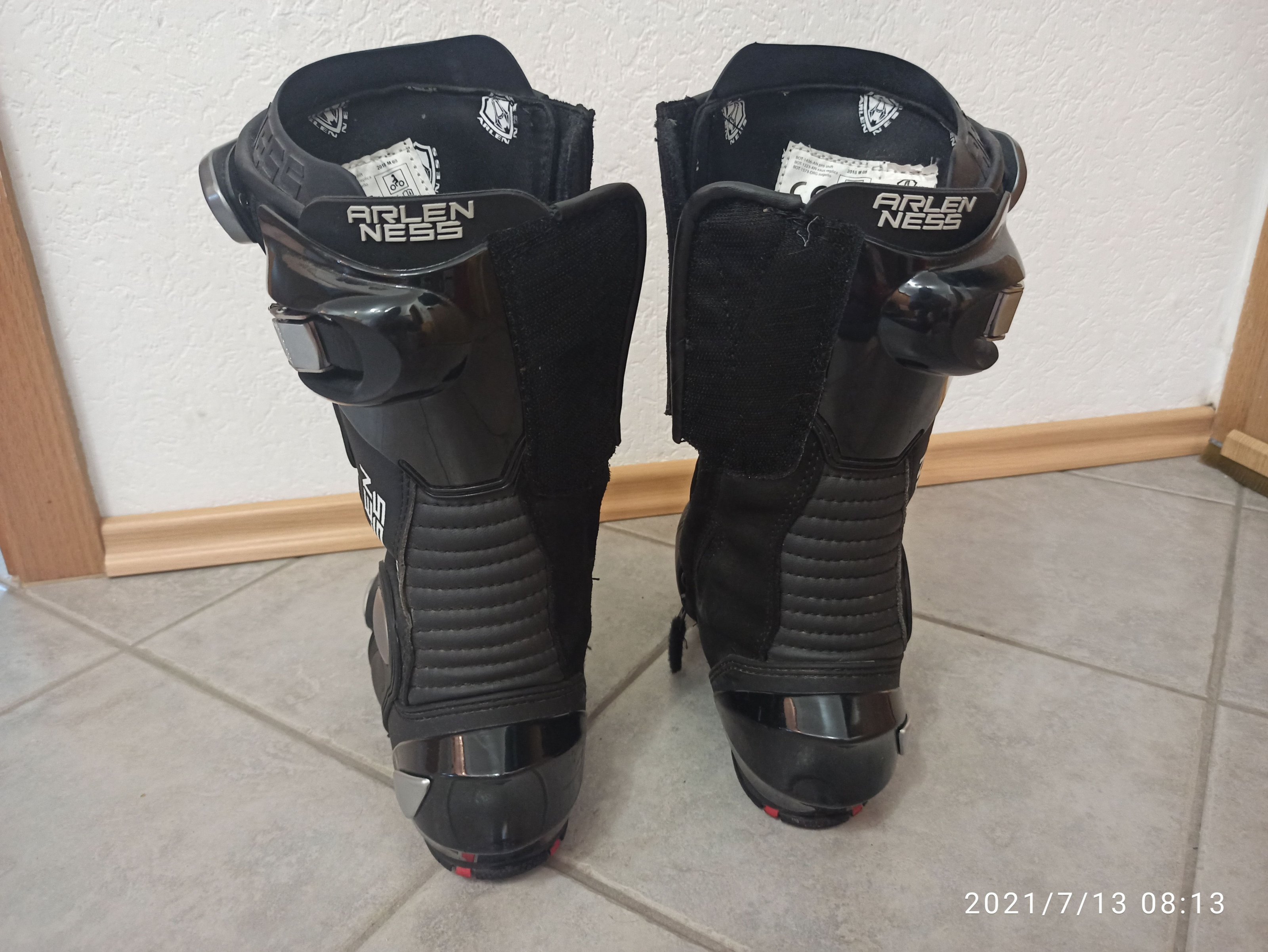 ich habe mir letztes Jahr erneut die genannten Sportstiefel gekauft und damit eine Tour (ca. 2000 Km) gefahren. Leider haben sich die Stiefel für meinen breiten Fuß nicht genug geweitet. Es sind natürlich entsprechende Gebrauchsspuren an den Stiefeln - siehe Bilder.