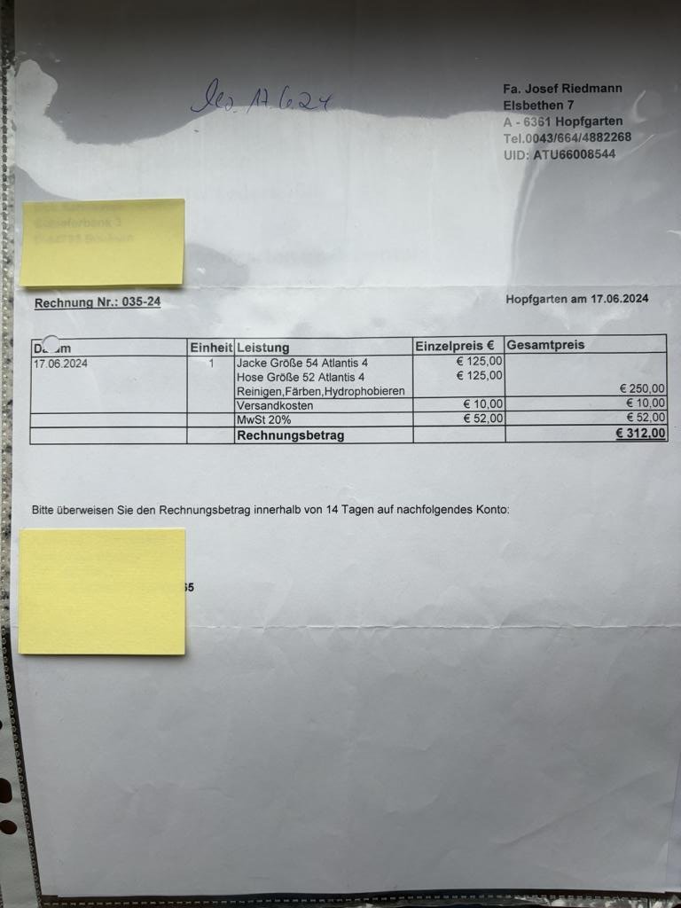 Im Juni 2024 wurde der Atlantis, von der Fa. Riedmann in Österreich, für insgesamt 312,- aufgearbeitet (siehe Rechnung) und danach nicht mehr getragen.