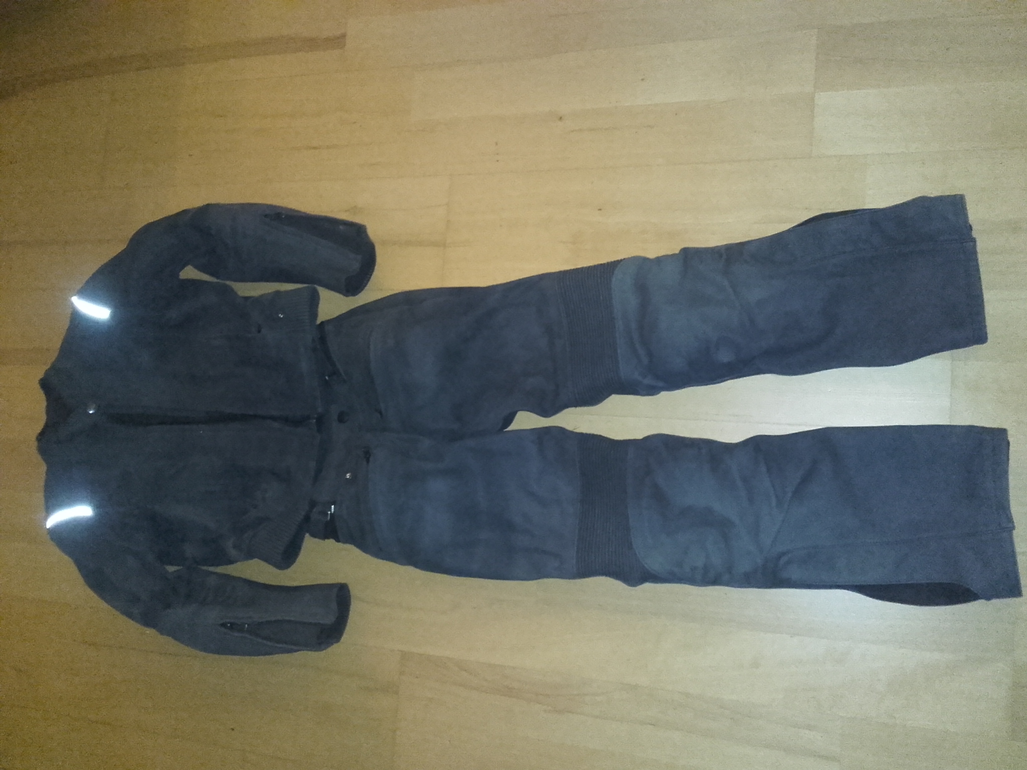 Jacke Größe 42, Hose Größe 40. Alle Zipper in Ordnung, Innenfutter top, Schulter, Ellbogen, Hüft, Knie- und Rückenprotektoren selbstverständlich dabei. Klettverschlüsse nicht verfranst, Verbindungsreißverschlüsse einwandfrei. Rauch- und Tierfreier Haushalt.