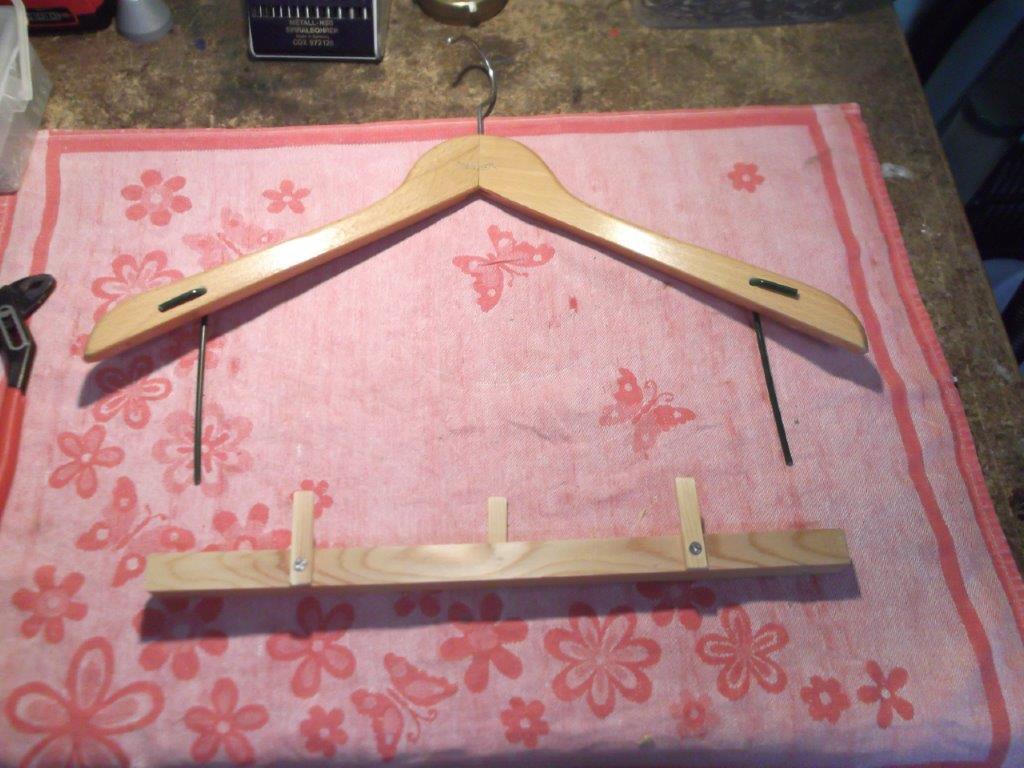 unten das Teil, das mit den drei Haken die Hosenträgerlaschen aufnimmt. Die Leiste wird mit den zwei Drahten am Bügel befestigt.