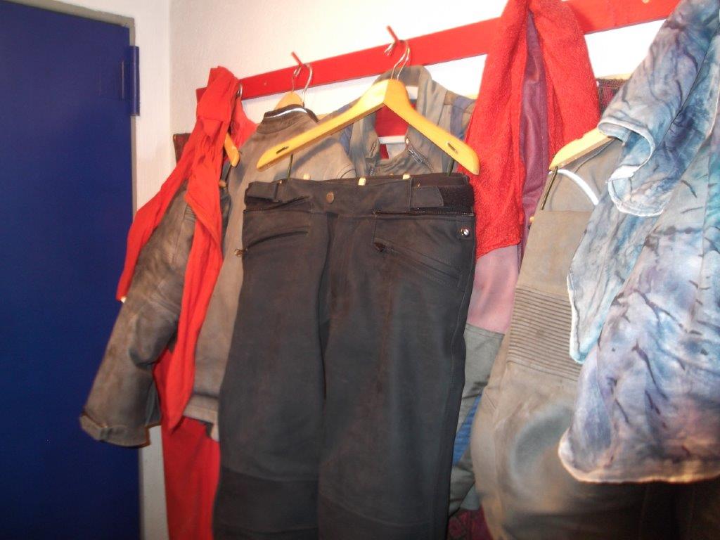 Die neue Kombi, Atlantis ohne Index (seltsam), trägt sich wie eine Ritterrüstung. Da einzusteigen wenn Jacke und Hose verbunden sind, ich pack es (noch) nicht. Aus diesem Grund muss die Jacke getrennt von der Hose angezogen und deswegen auch getrennt auf einen Bügel. Das heißt zwei Bügel nebeneinander, die viel Platz benötigen.