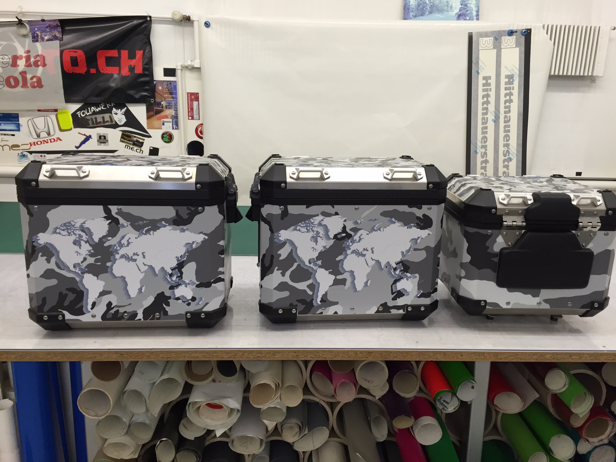 Nur diese photo habe ich,design kann ich immer noch wechslen,Schablonen für Koffer war schwer zum zeichnen,habe aus ein stück gemacht,gedruckt,laminiert,mit plotter geschnitten,geklebt,und jede loch hat past.