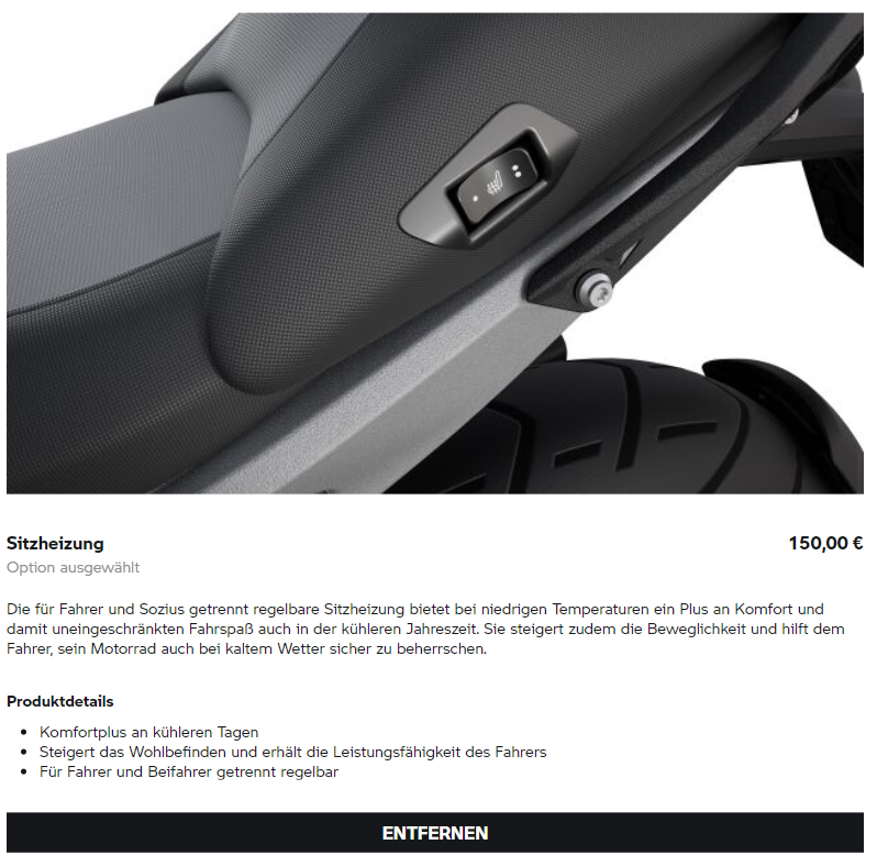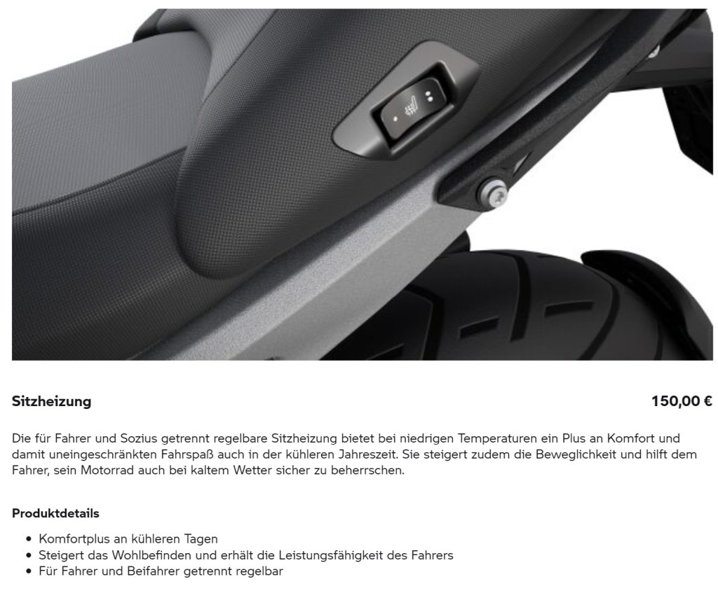 Ich hatte Glück und „aus Versehen“ die Sitzheizung einzeln gewählt, ohne Soziuspaket. Und das, obwohl das Bild im Konfi immer den fetten Sozius anzeigte. 😱