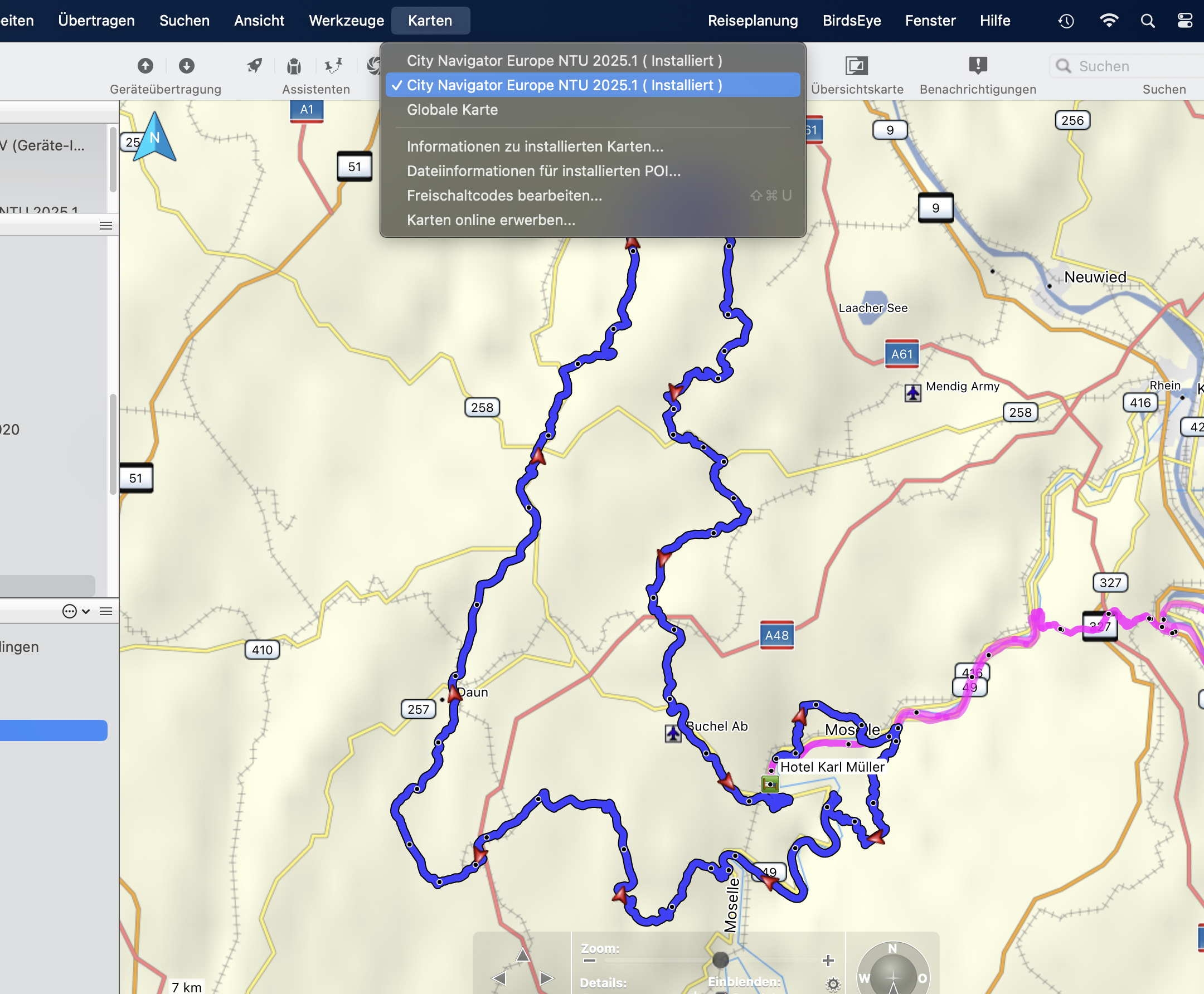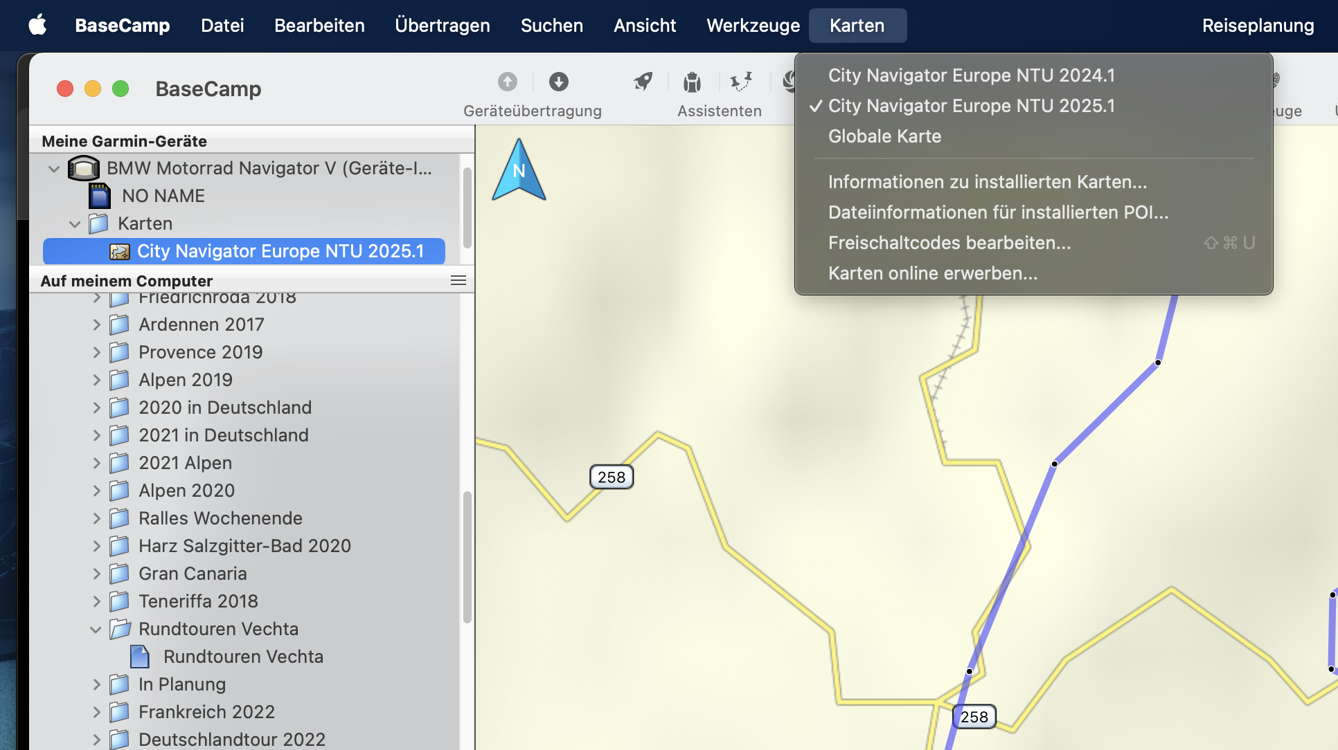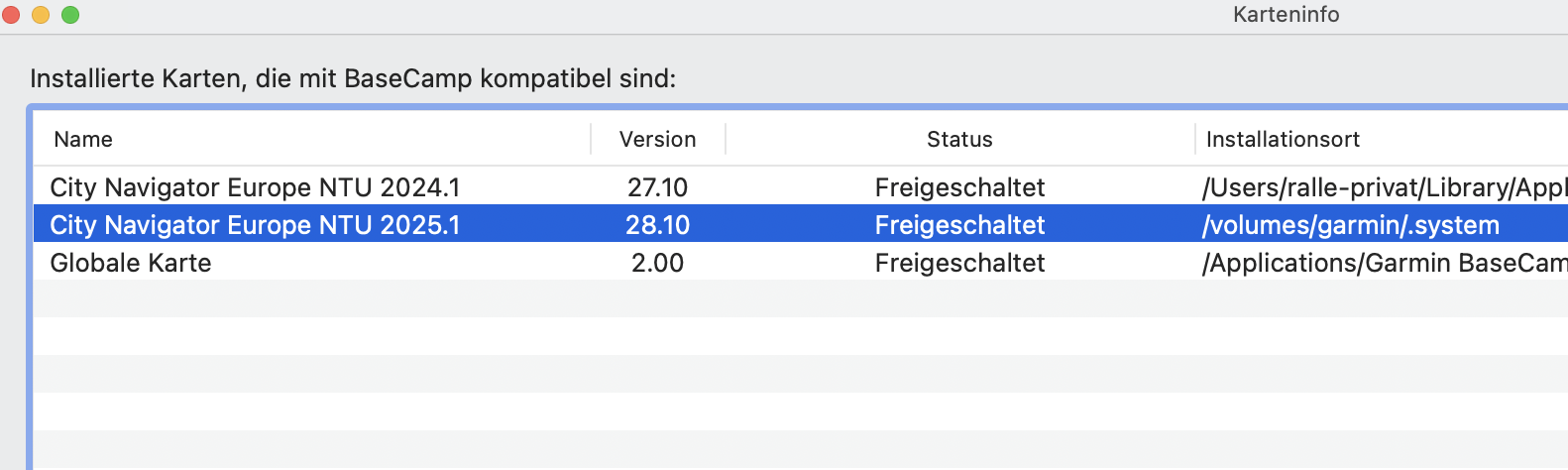 Ich habe in BaseCamp (Mac) seit dem Kartenupdate auf "City Navigator Europe NTU 2025.1" keine detaillierte Karte mehr auf dem Computer. Siehe Screenshots: Die Karte auf dem Navigator 5 ist detailliert, die parallel auf dem MacBook installierte und demnach identische Karte jedoch nicht. Wenn ich die lokale Karte downgrade auf die 2024.1, ist deren Detailgrad in BaseCamp wieder normal.
