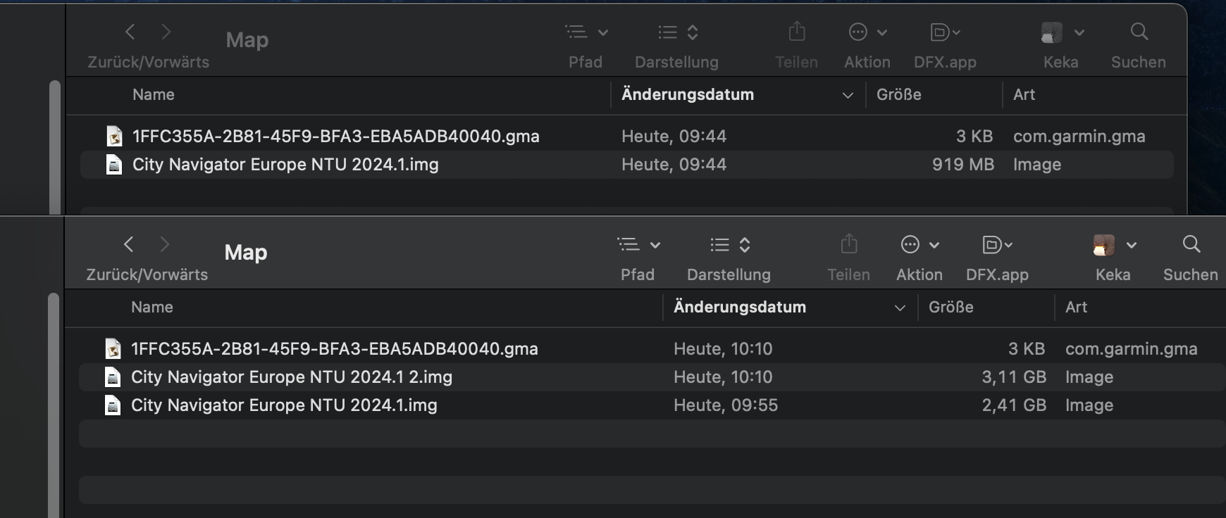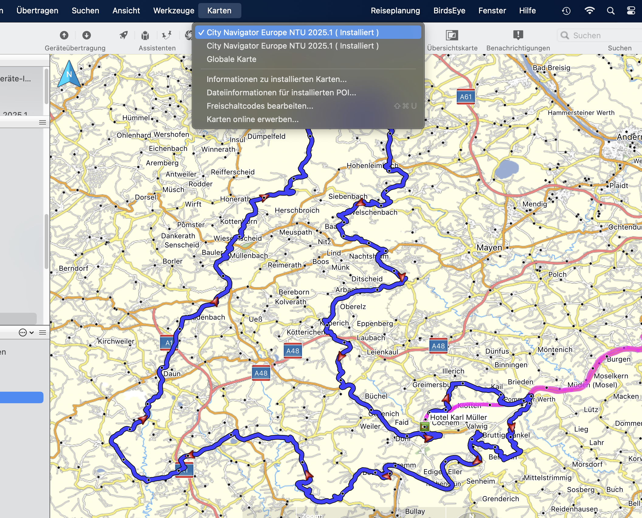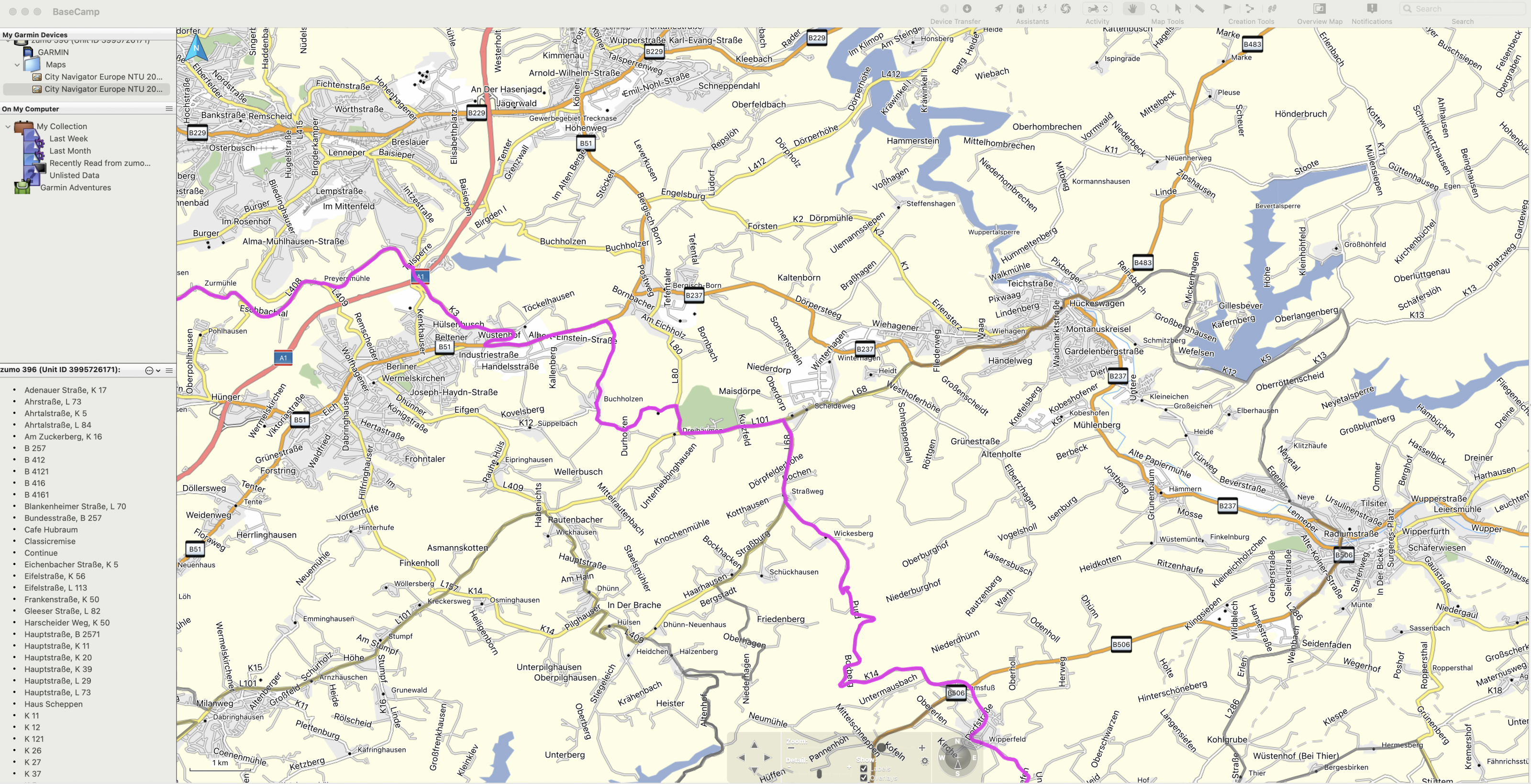 Ich habe in BaseCamp (Mac) seit dem Kartenupdate auf "City Navigator Europe NTU 2025.1" keine detaillierte Karte mehr auf dem Computer. Siehe Screenshots: Die Karte auf dem Navigator 5 ist detailliert, die parallel auf dem MacBook installierte und demnach identische Karte jedoch nicht. Wenn ich die lokale Karte downgrade auf die 2024.1, ist deren Detailgrad in BaseCamp wieder normal.