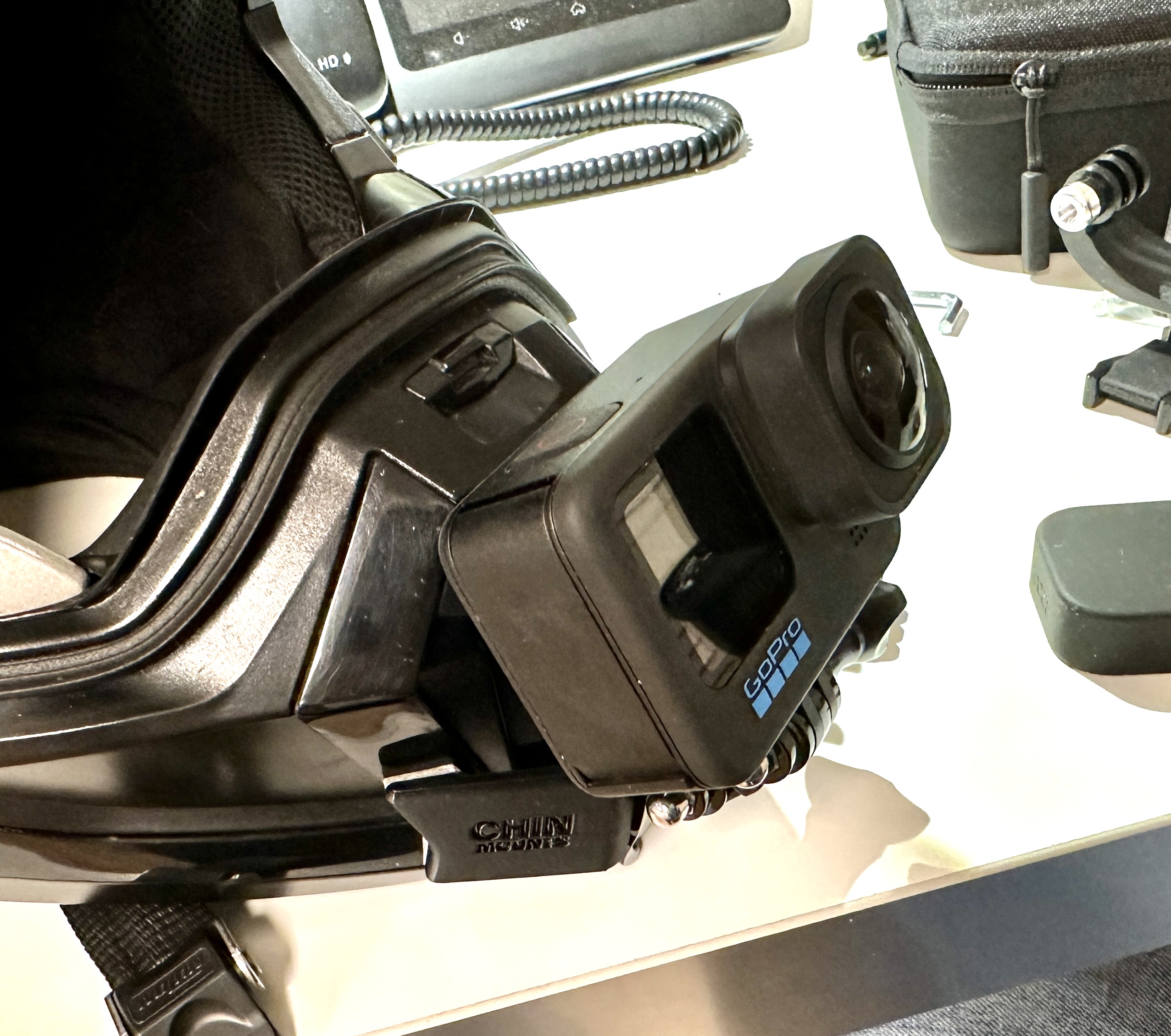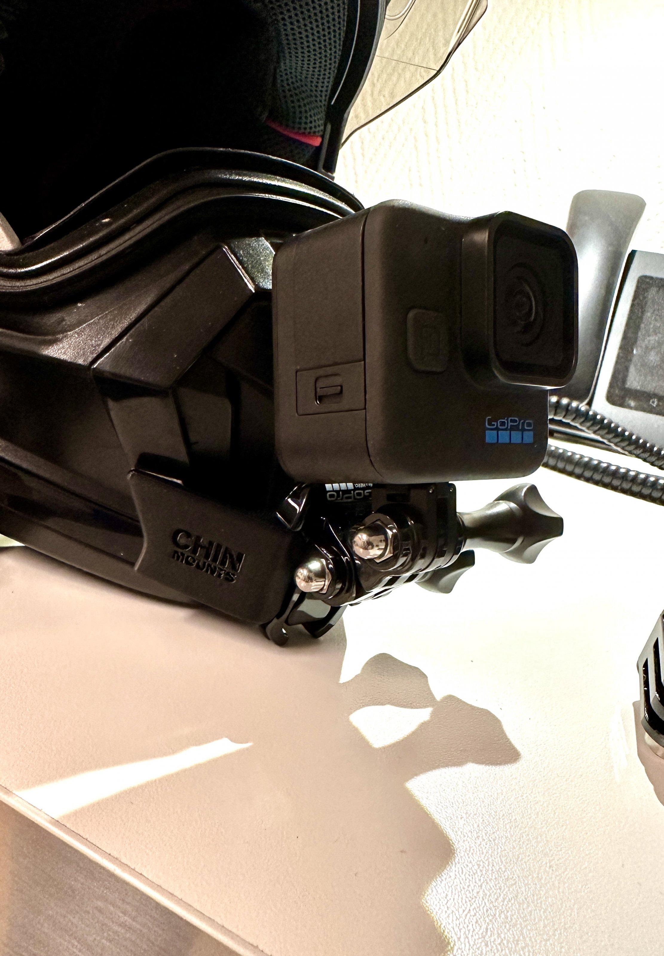 ich möchte an meine BMW GS Carbon Evo Helm eine GoPro Hero im Kinnbereich befestigen. Von BMW habe ich die anhängende Befestigung gefunden.