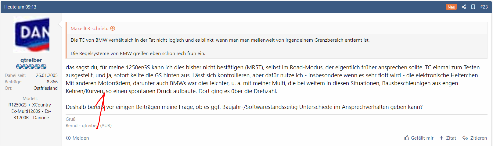 Ansonsten ist es für mich nicht verwerflich wenn die TC angeht, eher ein Zeichen , dass man am Reifen Limit ist und auch fahren kann.. Da ist sicher noch ein kleines Haftungspolster. Zumindest vorne wenn es hinten mit Gas regelt.