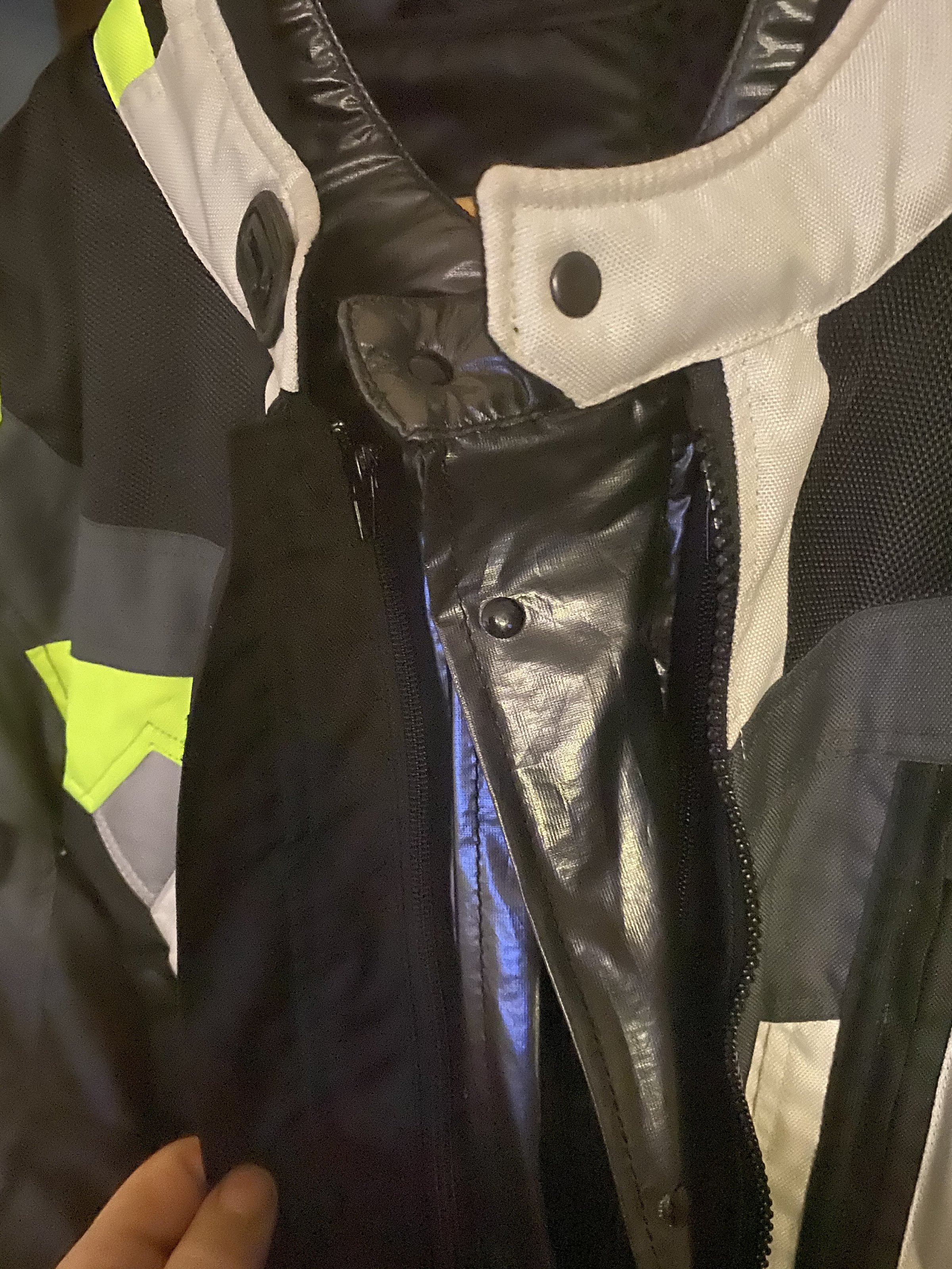 Sie besteht aus der Außenjacke, einer wasser-und winddichten Membrane die atmungsaktiv und abtrennbar ist. Ein Winter-Inlay ist auch noch vorhanden. Alle Jackenteile per Reißverschluss abtrennbar.