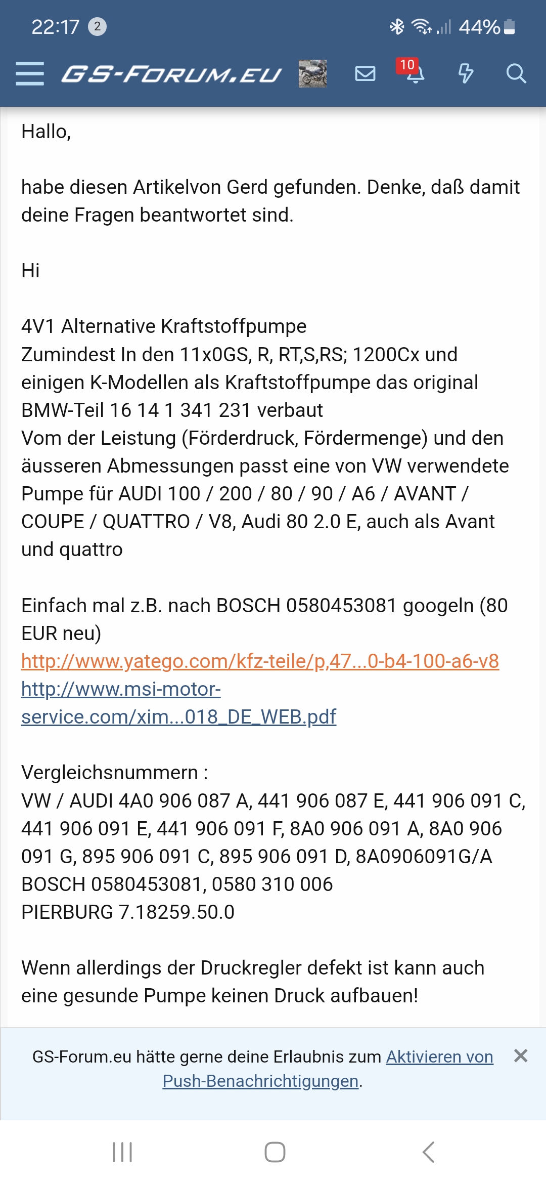 ich benötige wirklich sehr dringend Hilfe mit meiner Benzinpumpe. Die ist bei meiner 1100er GS am Sonntag ausgestiegen, ich habe sofort ne neue bestellt und die sollte morgen kommen. Das tut sie jetzt allerdings nicht und ich habe am Donnerstag ein absolut sehr wichtiges Event.
