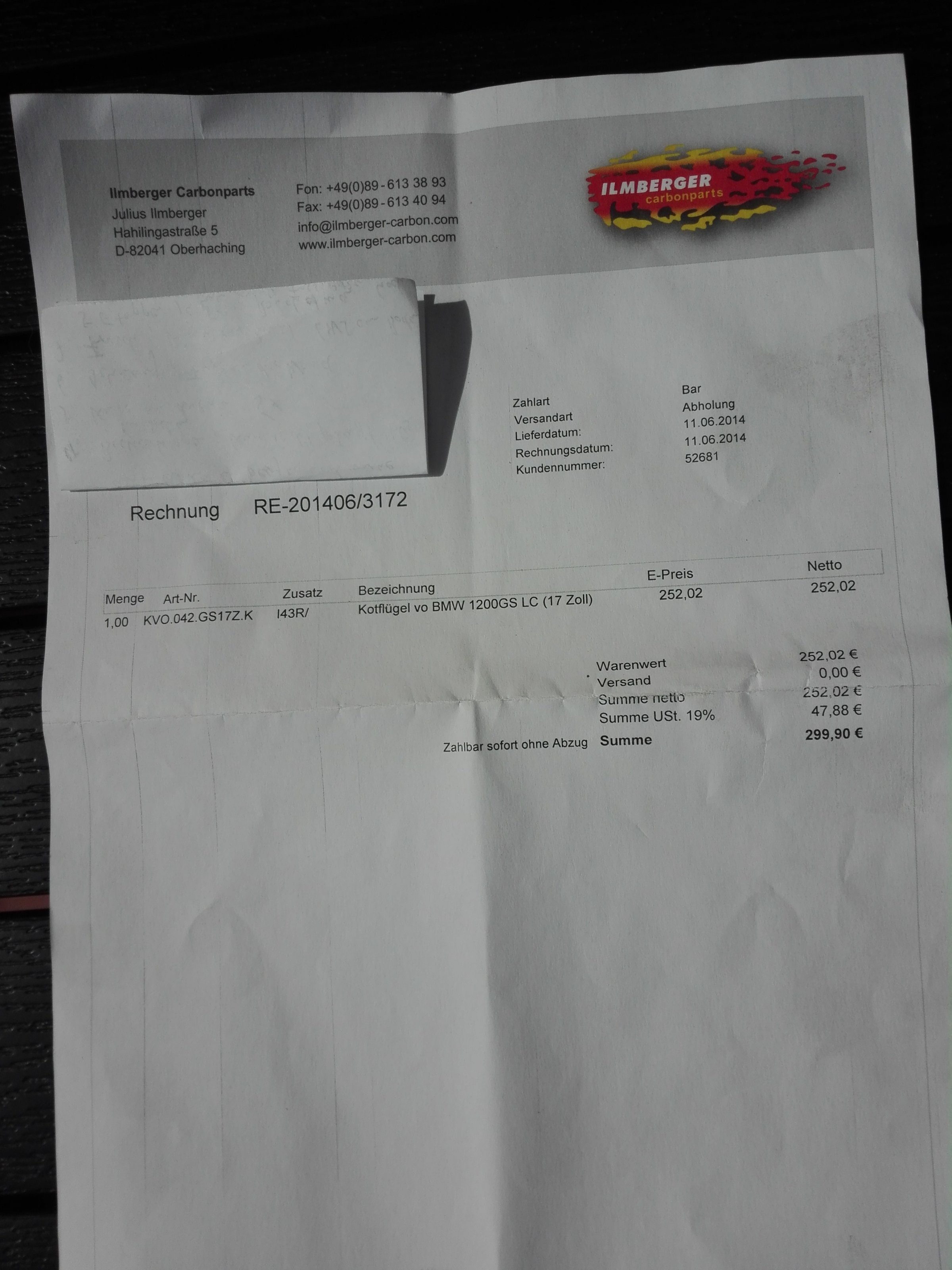 Zusätzlich verkaufe ich noch die passende vordere Radabdeckung in Sicht Karbon von der Firma Ilmberger mit passendem Montagesatz.