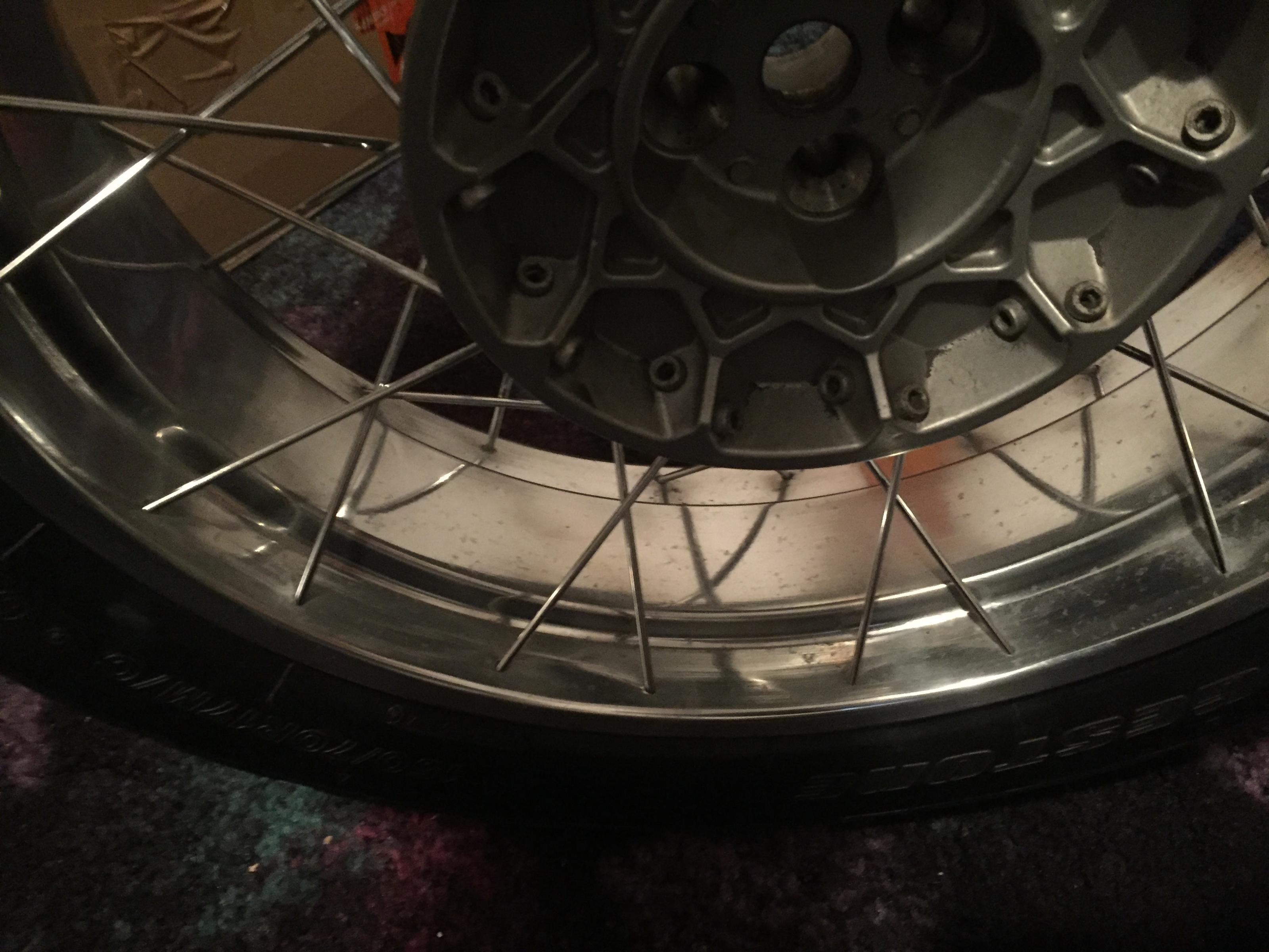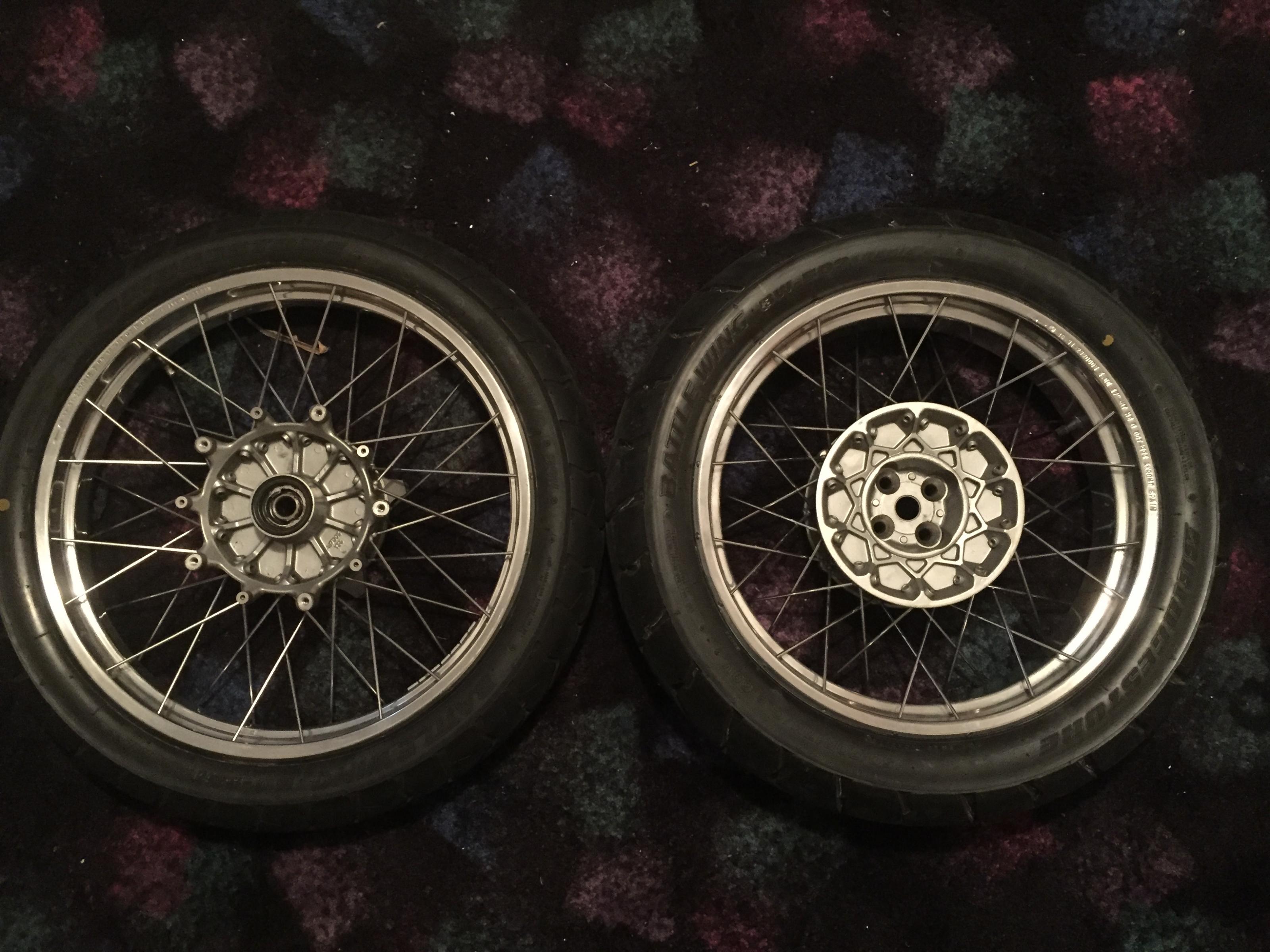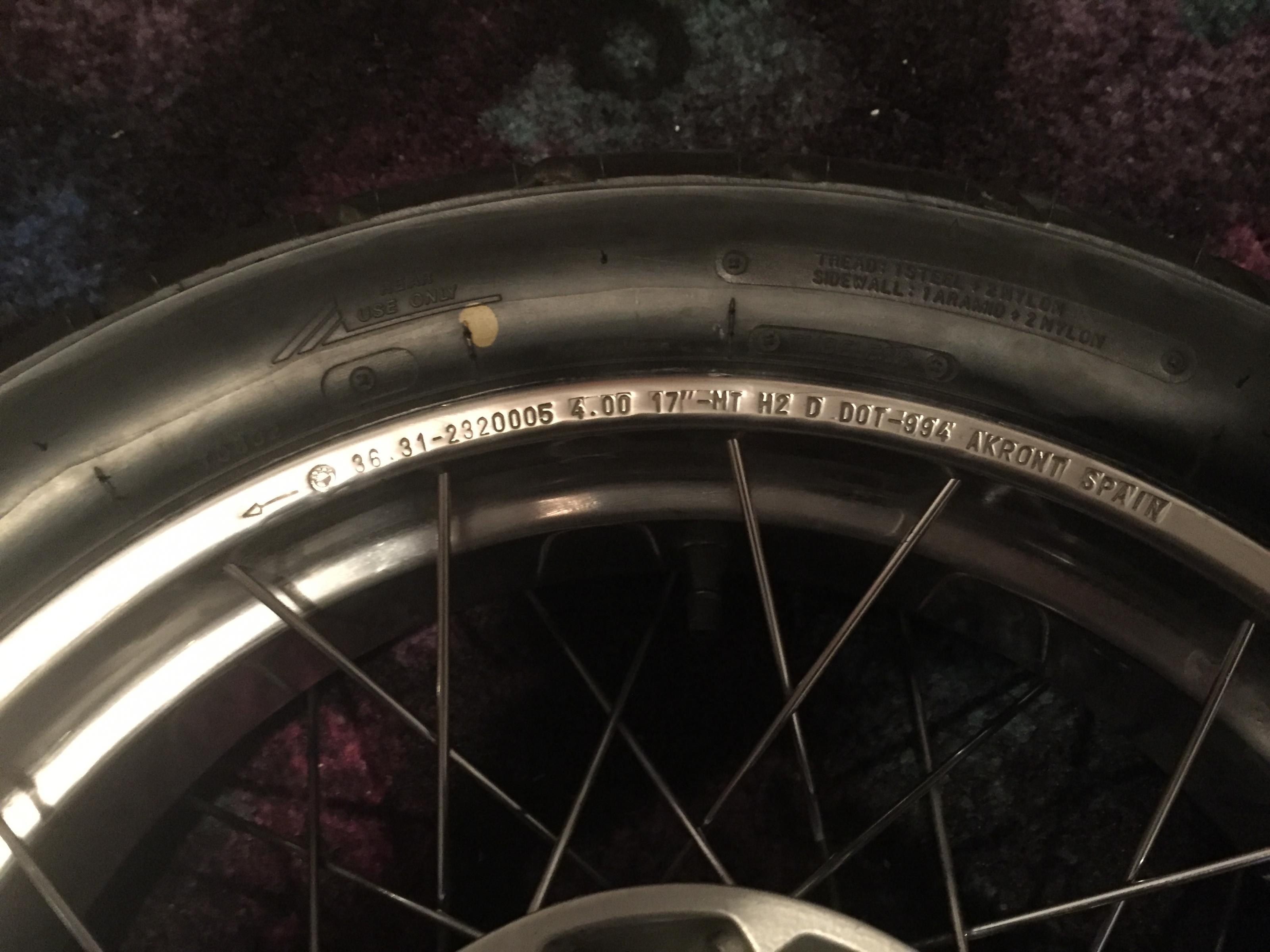 verkaufe einen originalen felgensatz für die r 1100 gs .es handelt sich um die schöneren polierten akront felgen.die felgen sind in sehr gutem zustand,,nur leicht angelaufen am felgenbett.die reifen die auf den felgen sind(Bridgestone bw 501/502)wurden letztes jahr im August erst aufgezogen und haben ca 800 km gelaufen.profiltiefe vorne 4 mm hinten 7 mm.dot nummer der reifen(vo 1216,hi 3714) also noch für einige tausend Kilometer.das bike hatte bei der Demontage der felgen 50000 km(kein gelände kein Unfall)