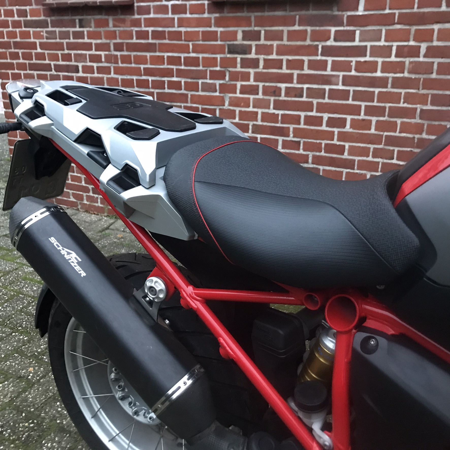 Schnitzer-Auspuffanlage, Solo-Sitzbank wurde individualisiert und mit roten Nähten passend zum Lack versehen.