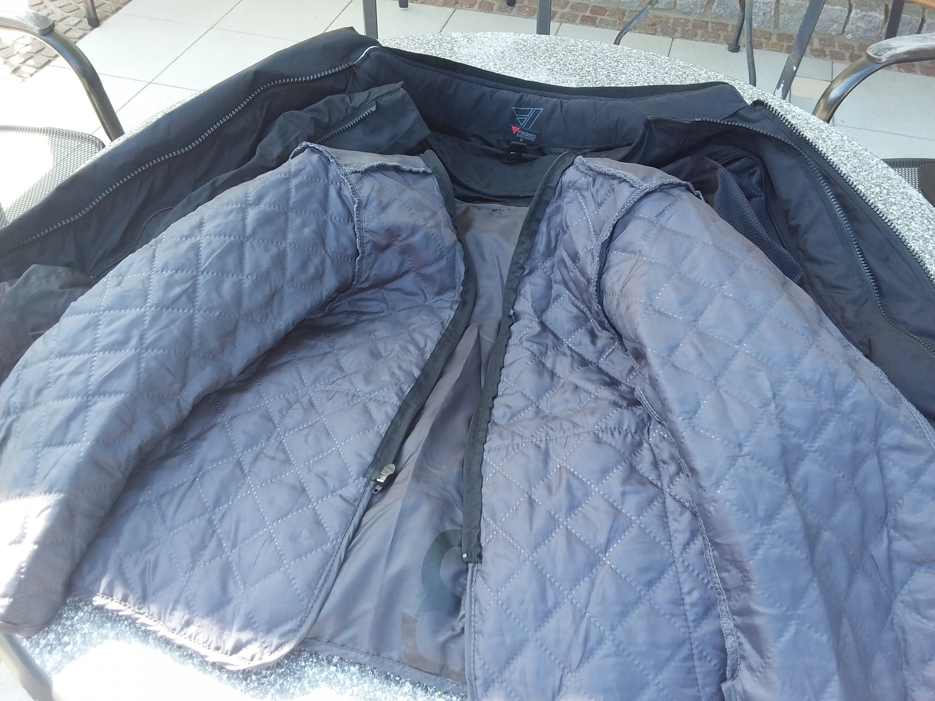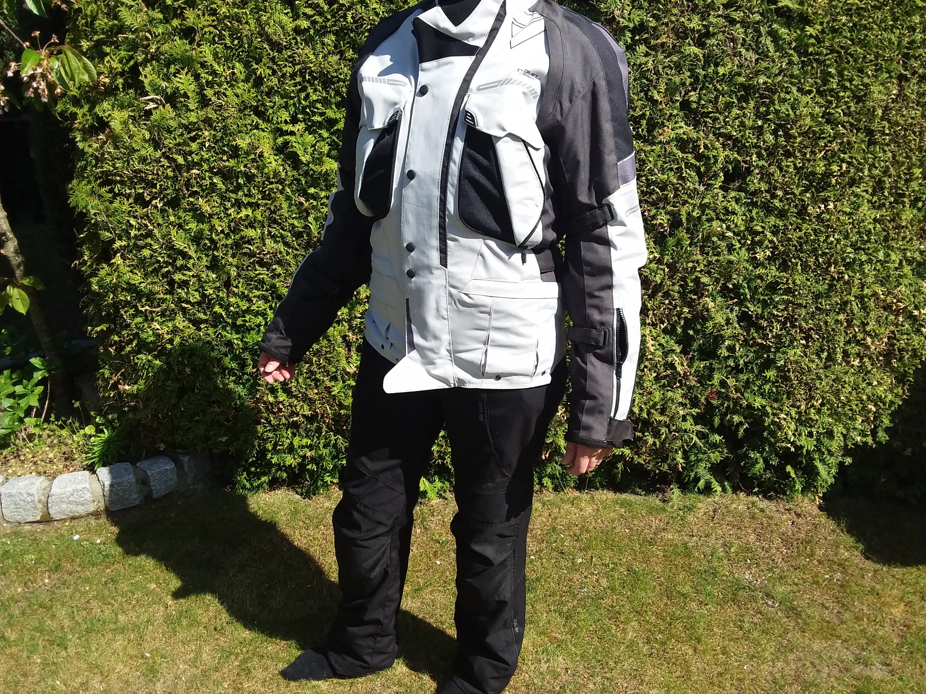 Modeka Textil Hose , 3 lagig , 35 Euro , Modeka Jacke Textil Westport , hell , sehr gute Belüftung 55 Euro , Vanucci Handschuhe Größe 7 20 Euro , für ehemals Konfektionsgröße xs 34 bzw 36 Damengröße , 175 cm , zierlich , 50 kg .