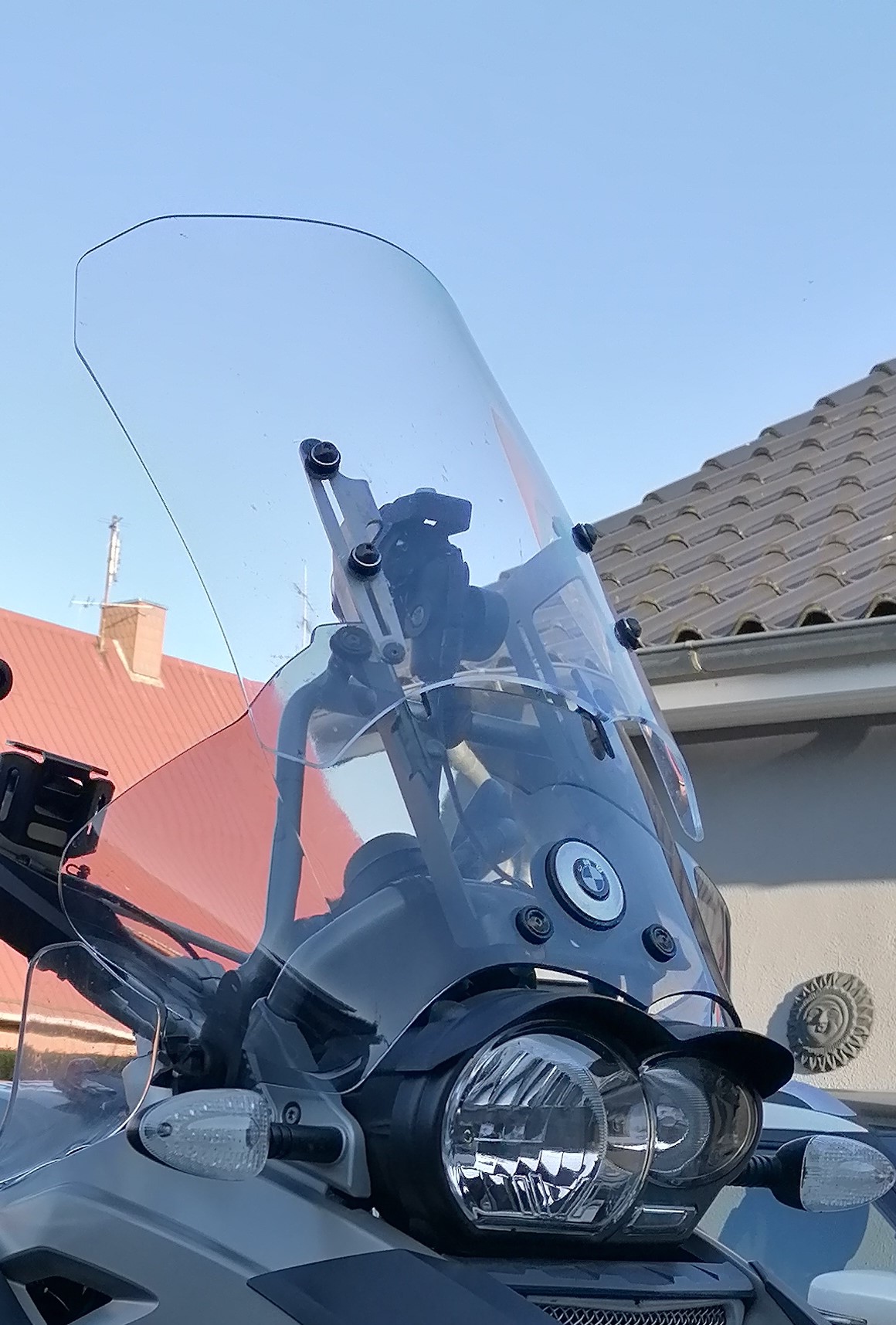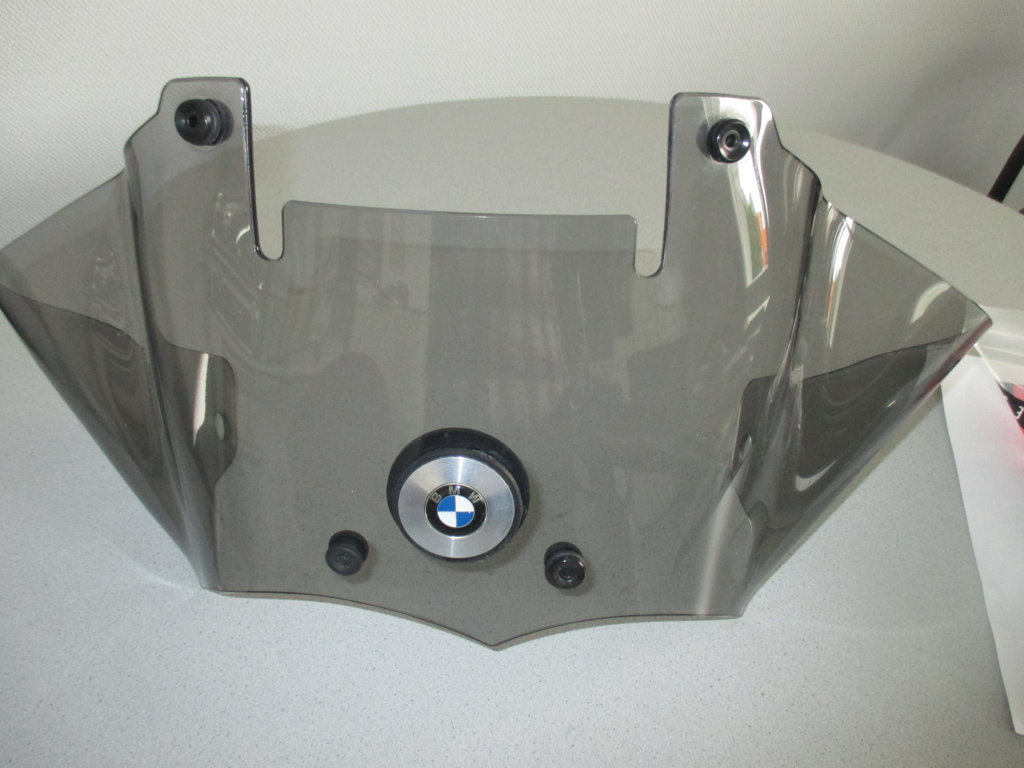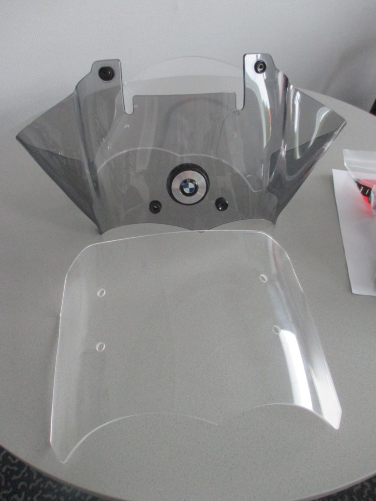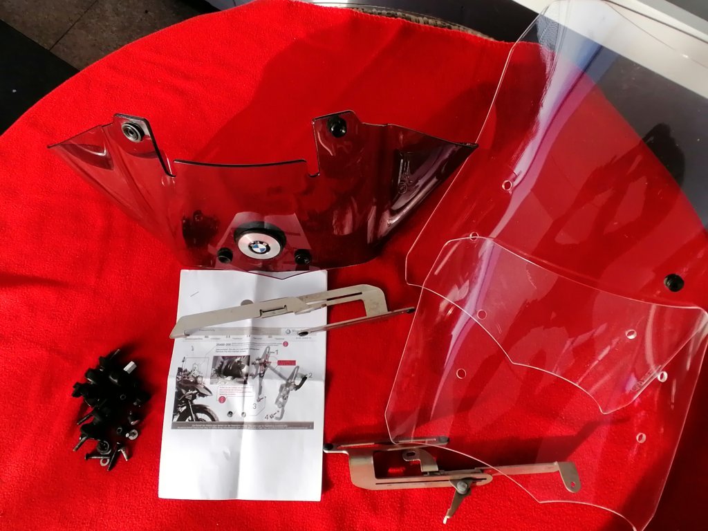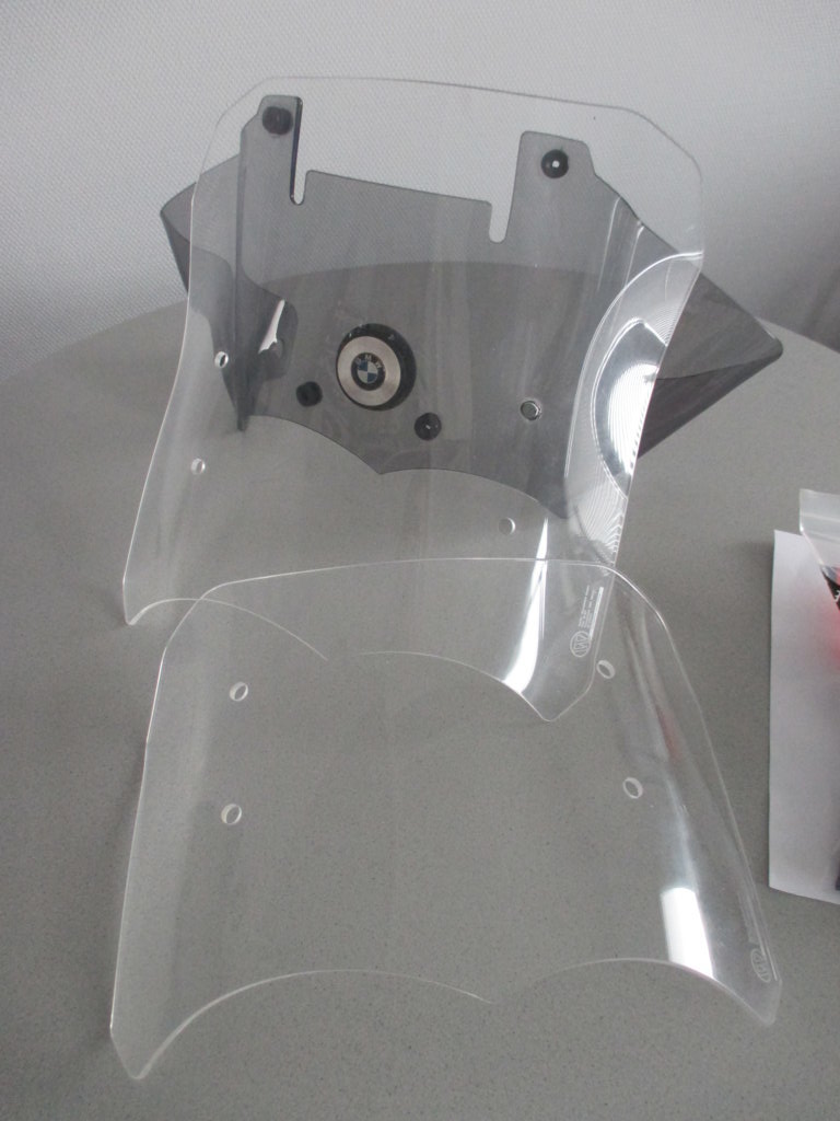 Die Scheibe war 1 Saison meiner 2010er R1200GS montiert. Die Scheibe ist zweiteilig, hat also eine feststehende & getönte untere Scheibe und eine verstellbare klare zweite Scheibe. Bei dem Kit sind zwei verschiedene obere Scheiben bei, die kleinere davon war noch nie montiert. Am besten, man schaut sich zur Scheibe dieses Youtube-Video von Wunderlich an: