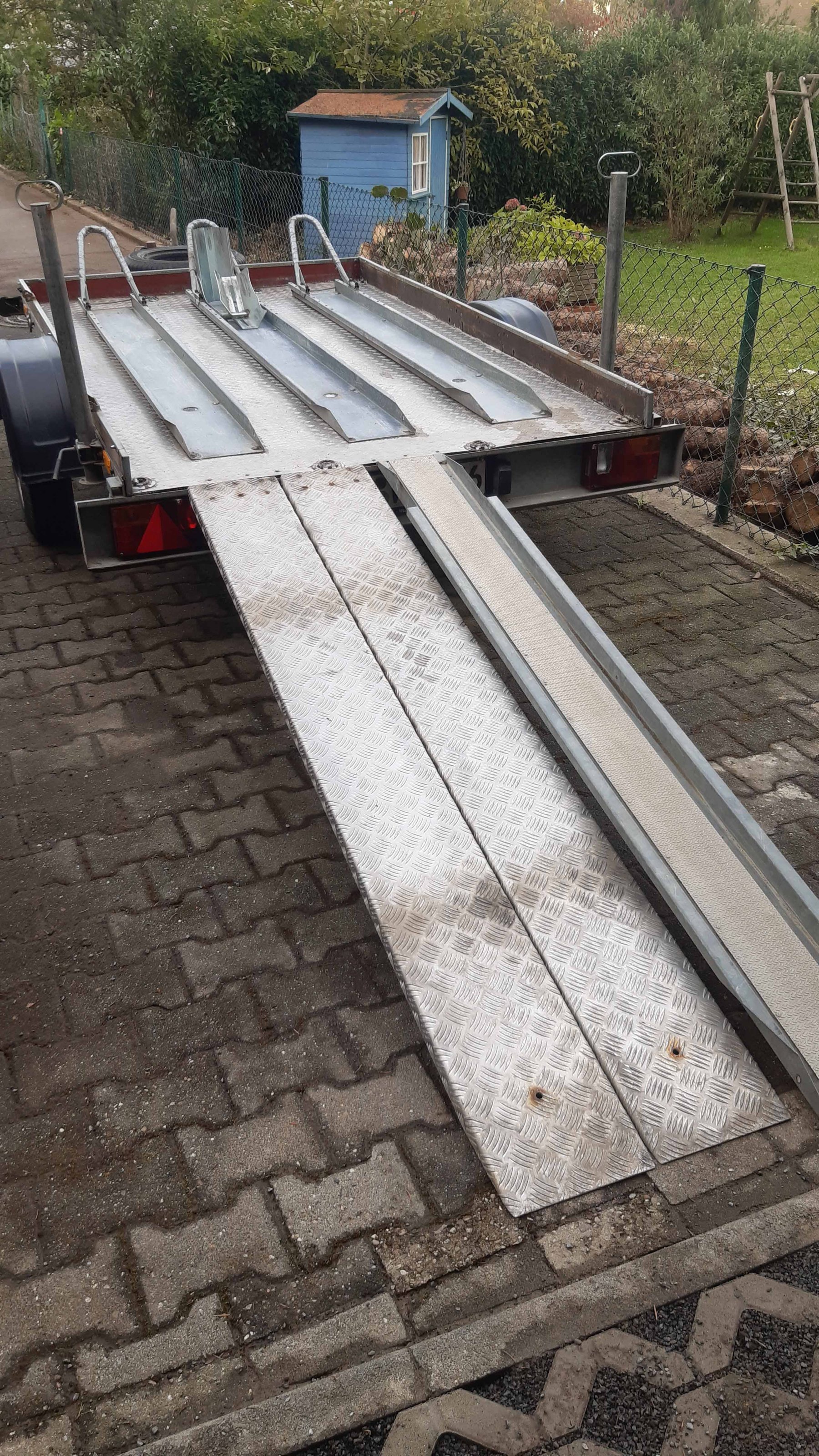 Hallo, biete meinen gebrauchten Agados-Motorradanhänger an. EZ 2002; TÜV 04/2022. Es passen 2 BMW-Boxer oder bis zu 3 schmale Motorräder auf die Ladefläche von ca. 250 x 150 cm. Die Bremsanlage und Elektrik wurden in der Fachwerkstatt generalüberholt. Der Hänger wurde "motorradtauglich" ausgebaut, so dass auch bei Regen Motorräder von einer Einzelperson verladen werden können. Er verfügt er über 2 stabile Alu-Laufschienen (so kann man das Motorrad alleine auf- oder runterfahren). Der Holzboden ist mit einem Alublech zusätzlich rutschfest abgedeckt. Die Auffahrschiene ist ebenfalls mit Alu-Riffelblech belegt, so dass das Motorrad auch im Nassen bewegt werden kann. Es ist ein Ersatzrad dabei. Eine Vorderradwippe (17-21 Zollreifen) kann gegen Aufpreis mit erworben werden. Der Hänger ist gebremst und gefedert und kann - mit entsprechenden Reifen - mit 100 Km/h Zulassung gefahren werden. Z.Z eit hat er jedoch keine 100 Km/h - Freigabe, da die Reifen älter als 6 Jahre sind (er stand die letzten Jahre nur noch herum). Des weiteren habe ich noch selbst gebaute Bordwände, die wechselweise angebaut werden können und bei diversen Transporten gute Dienste leisten; der Käufer kann diese gerne mitnehmen, wenn er Verwendung dafür hat.