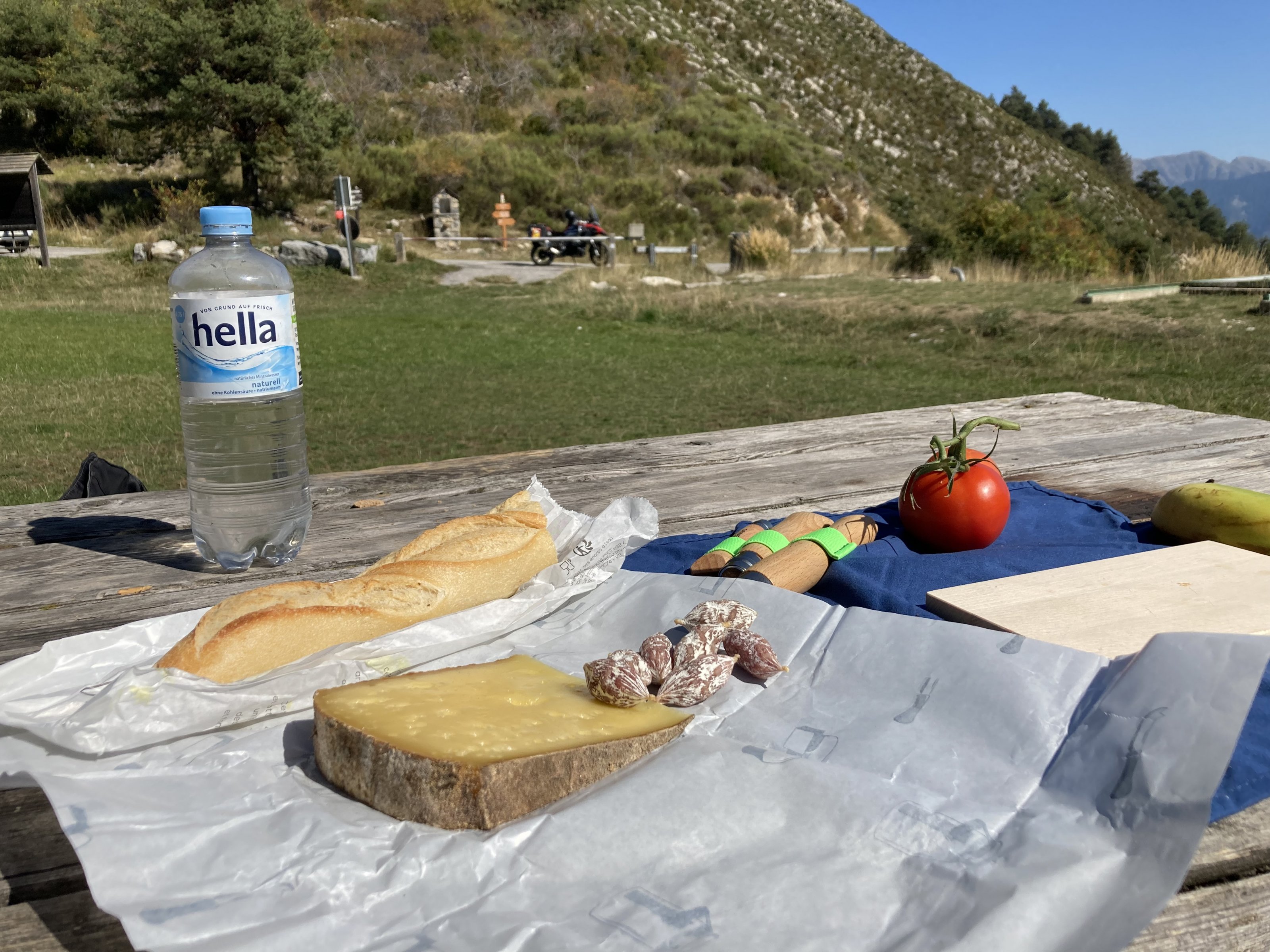 ich sitze auf der Bank (mit Tisch)