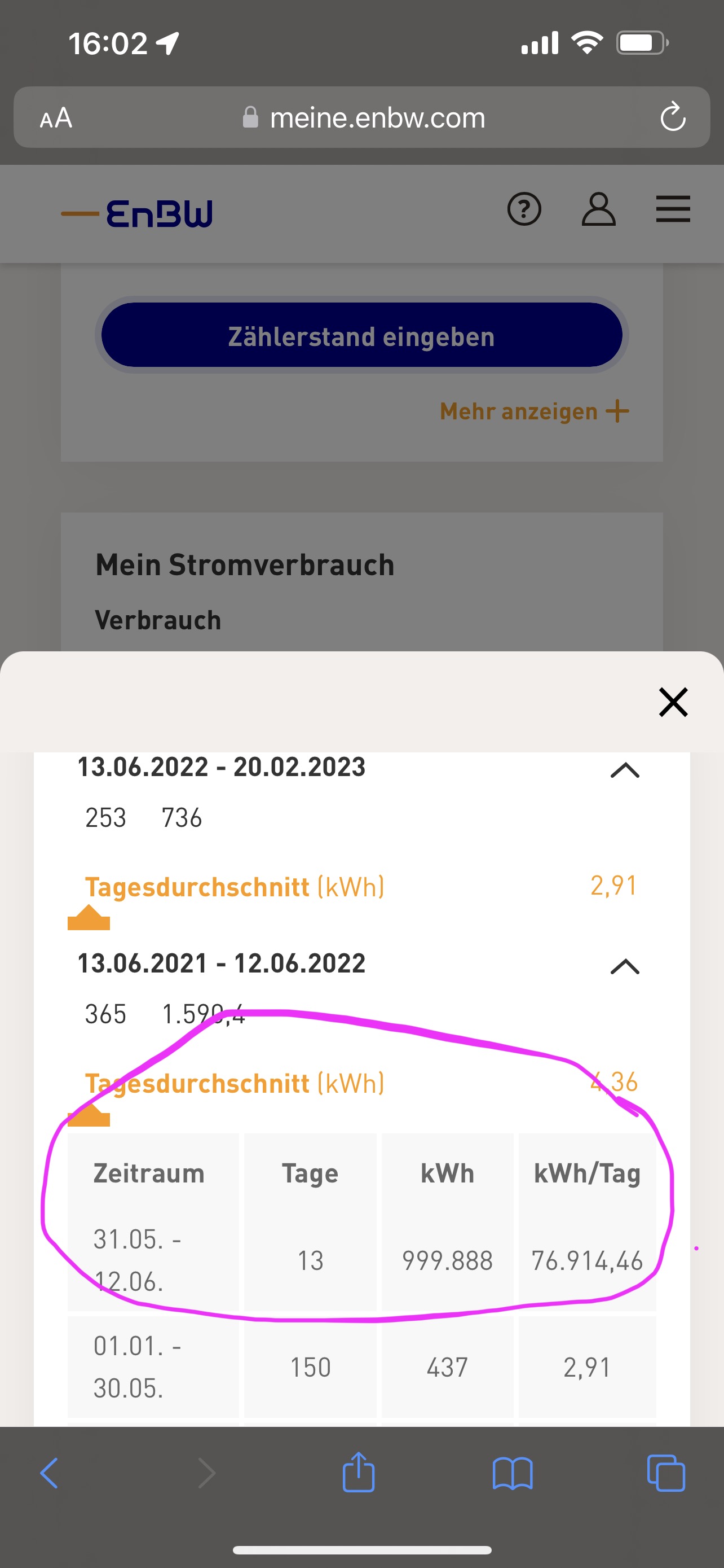 Ich muss das hier mal posten, die haben den Pranger verdient.. EnBW Wärmestrom ... Man beachte den angeblichen Verbrauch innerhalb von 13 Tagen im letzten Jahr... hat wohl ein besoffener programmiert und getestet...